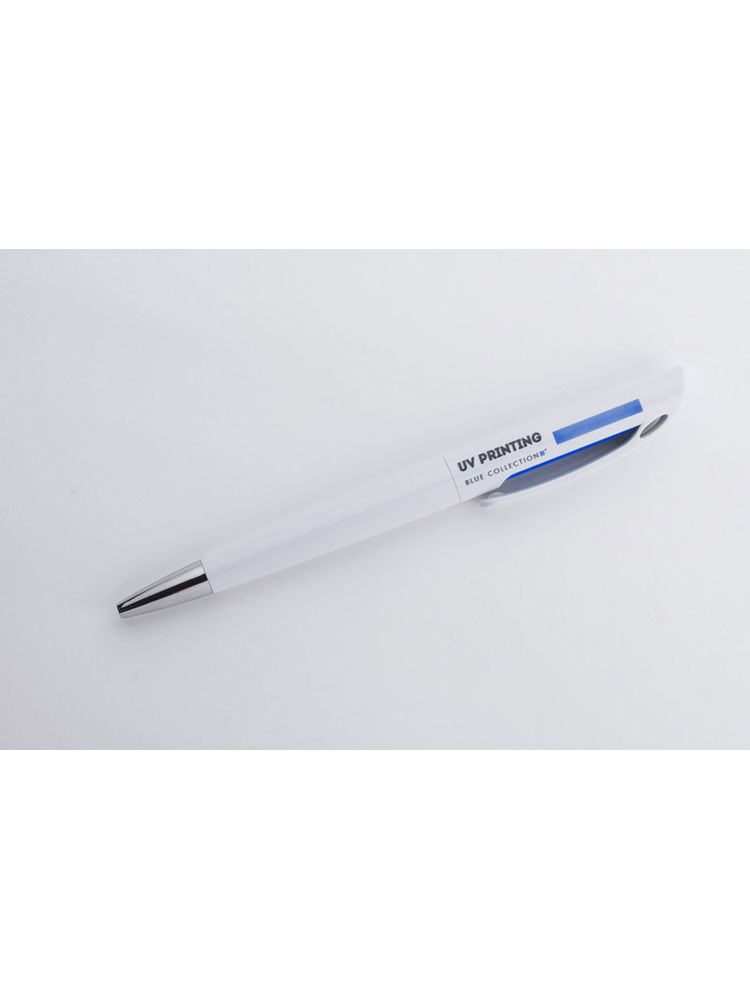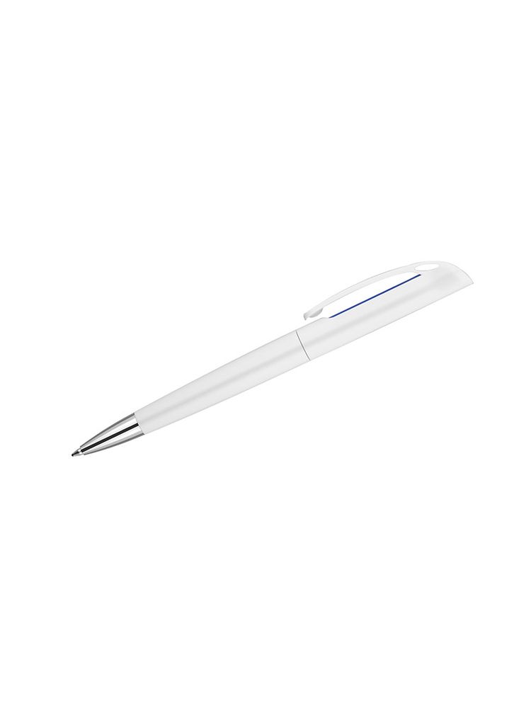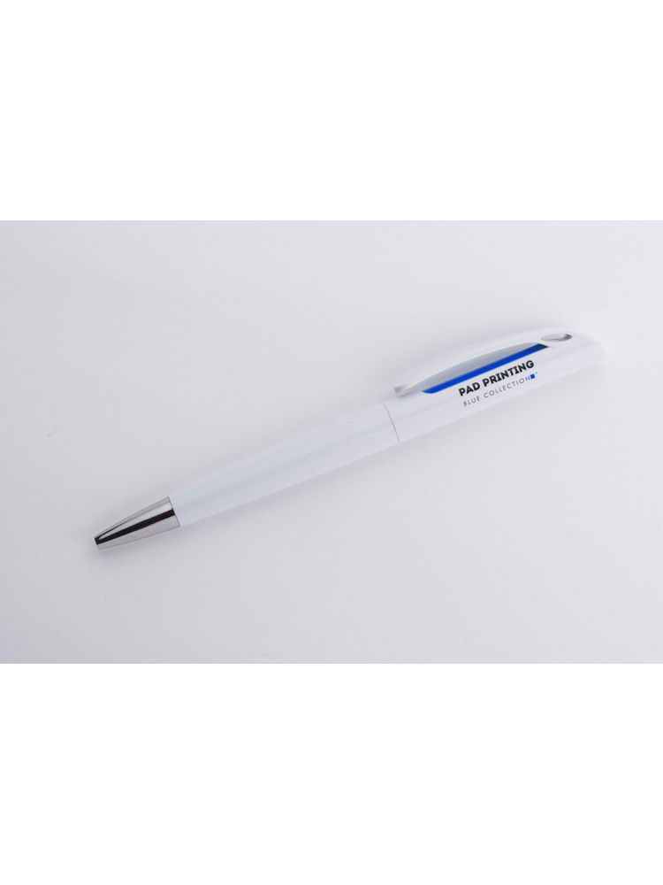 INTER to klasyczny długopis z tworzywa sztucznego. Korpus w białym kolorze z kolorowym zdobieniem pod klipem. Długopis typu twist. Wkład o grubości 0,7 mm w kolorze niebieskim.