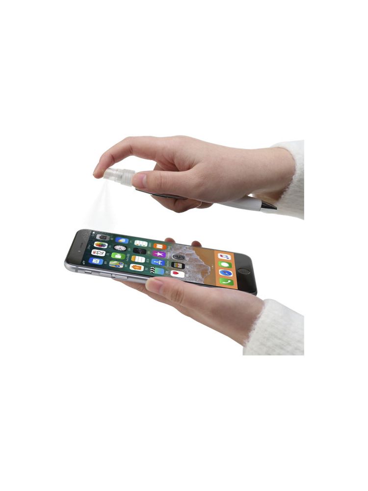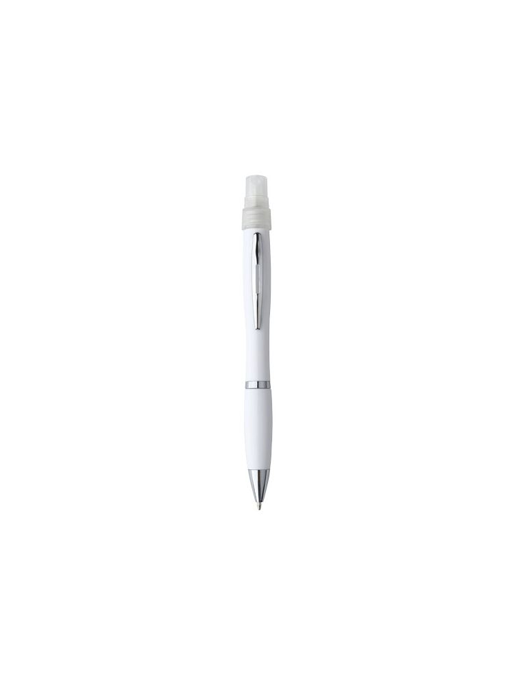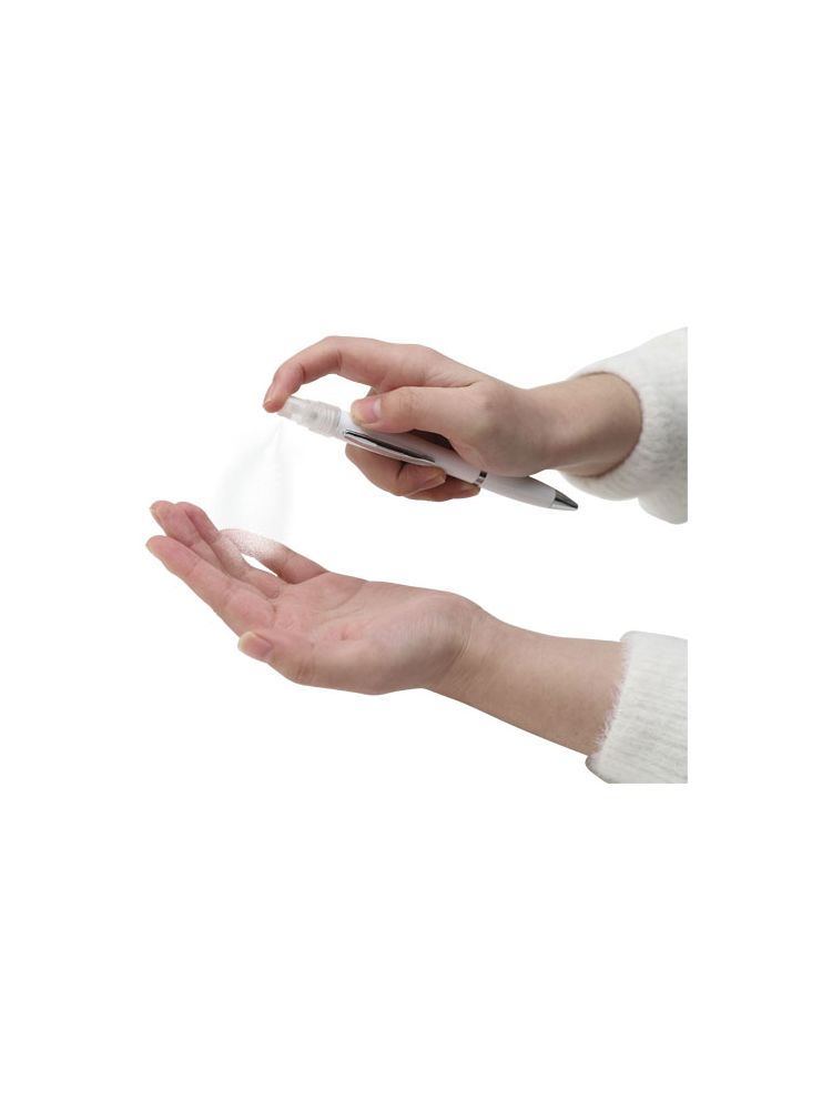 Długopis ze spryskiwaczem do wielokrotnego napełniania i nasadką ochronną na górze. Spryskiwacz może zostać w dowolnym momencie napełniony alkoholem lub innym płynem dezynfekcyjnym do rąk i /lub do dezynfekcji powierzchni. Aby napełnić spryskiwacz wystarczy odkręcić dyszę. Pojemność spryskiwacza wynosi 3 ml. Płyn nie jest dołączony.