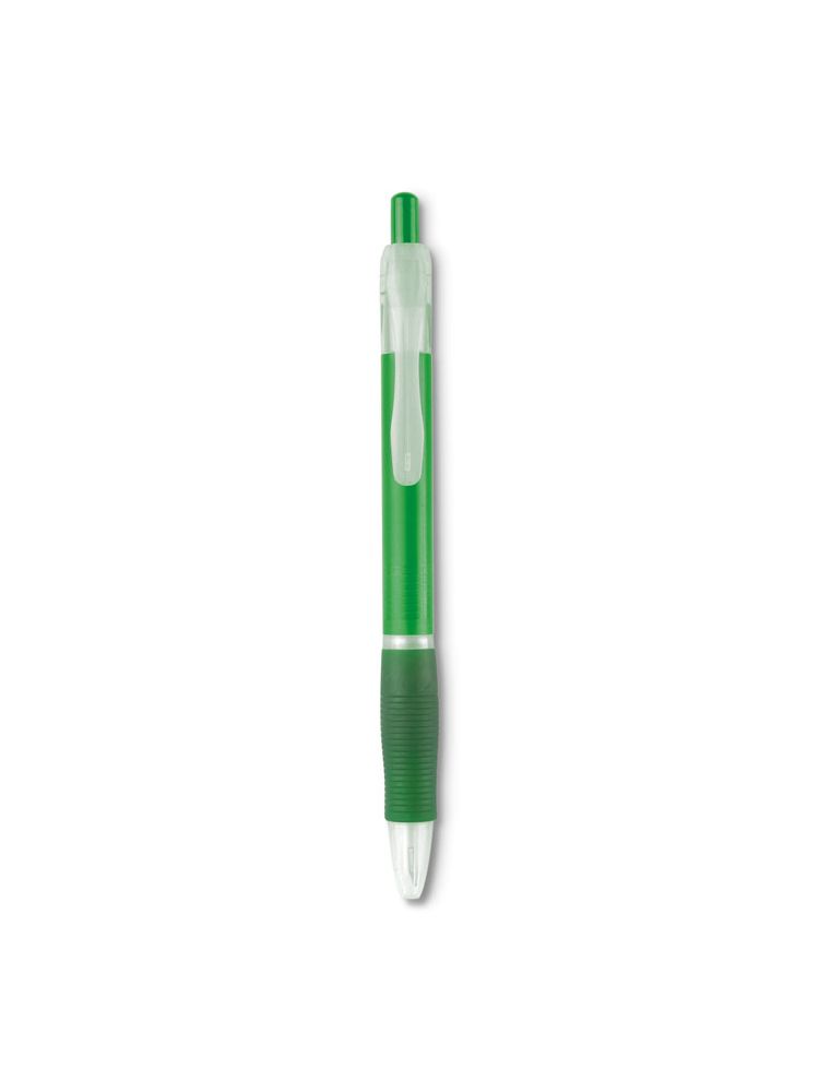 Przyciskany plastikowy długopis z gumowym uchwytem. Czarny wkład.