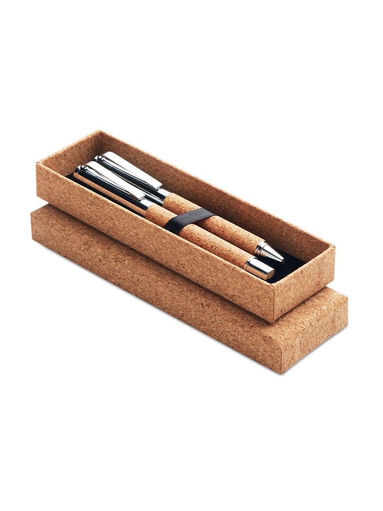 Metalowy zestaw do pisania. Długopis (mechanizm obrotowy) i roller (ze skuwką). Obudowa z korka. Zapakowane w dopasowane pudełko z korka. Odpowiednio niebieski i czarny atrament. Korek jest materiałem naturalnym, ze względu na jego strukturalną naturę i porowatość powierzchni ostateczny wygląd nadruku na każdym artykule może się różnić.