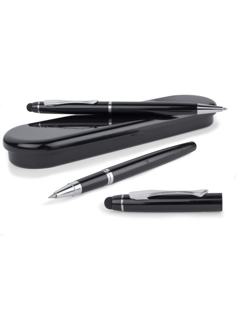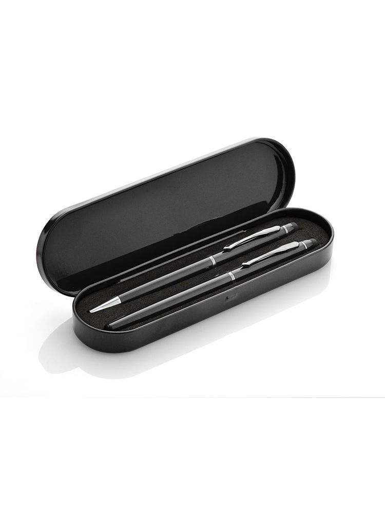 Solidny i nowoczesny komplet piśmienniczy – zawiera długopis oraz pióro kulkowe z końcówką do ekarnów dotykowych (touch). Zapakowany został w metalową puszkę w tym samym kolorze, co artykuły piśmiennicze.