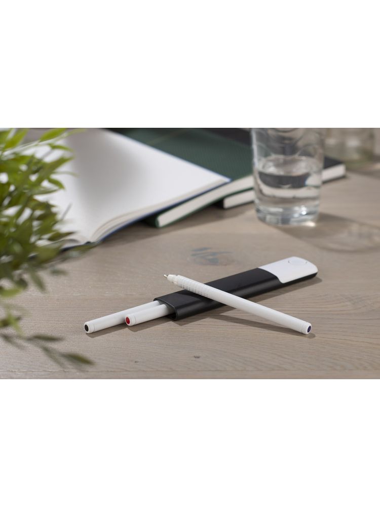HOP to praktyczny zestaw piśmienniczy zawierający niezbędne akcesoria zapakowane w innowacyjne etui z tworzywa sztucznego. Długopisy umieszczone wewnątrz trzymane są przez specjalny mechanizm, który uniemożliwia ich wypadanie. Naciśnięcie przycisku znajdującego się na dole etui zwalnia blokadę i umożliwia wyjęcie długopisów. W zestawie znajduje się długopis w kolorze niebieskim, długopis w kolorze czerwonym oraz ołówek wieczny niewymagający temperowania. Całość wykonana została z tworzywa sztucznego, dzięki czemu zestaw jest niezwykle lekki. HOP to idealny prezent dla nauczycieli, studentów i uczniów, który zmieści się w każdej torebce i plecaku