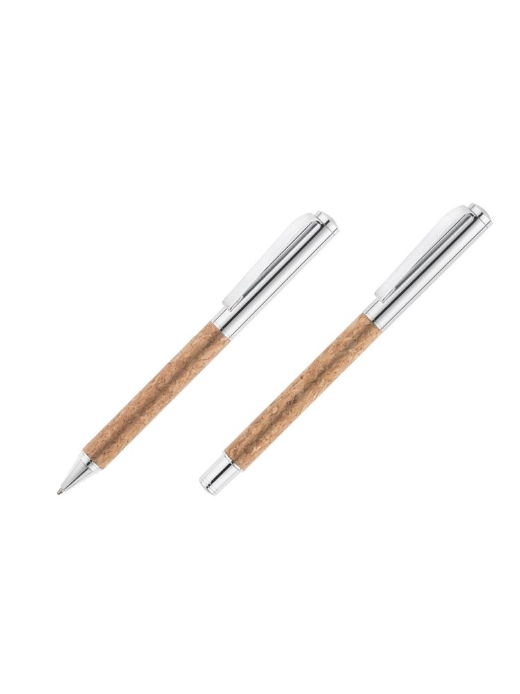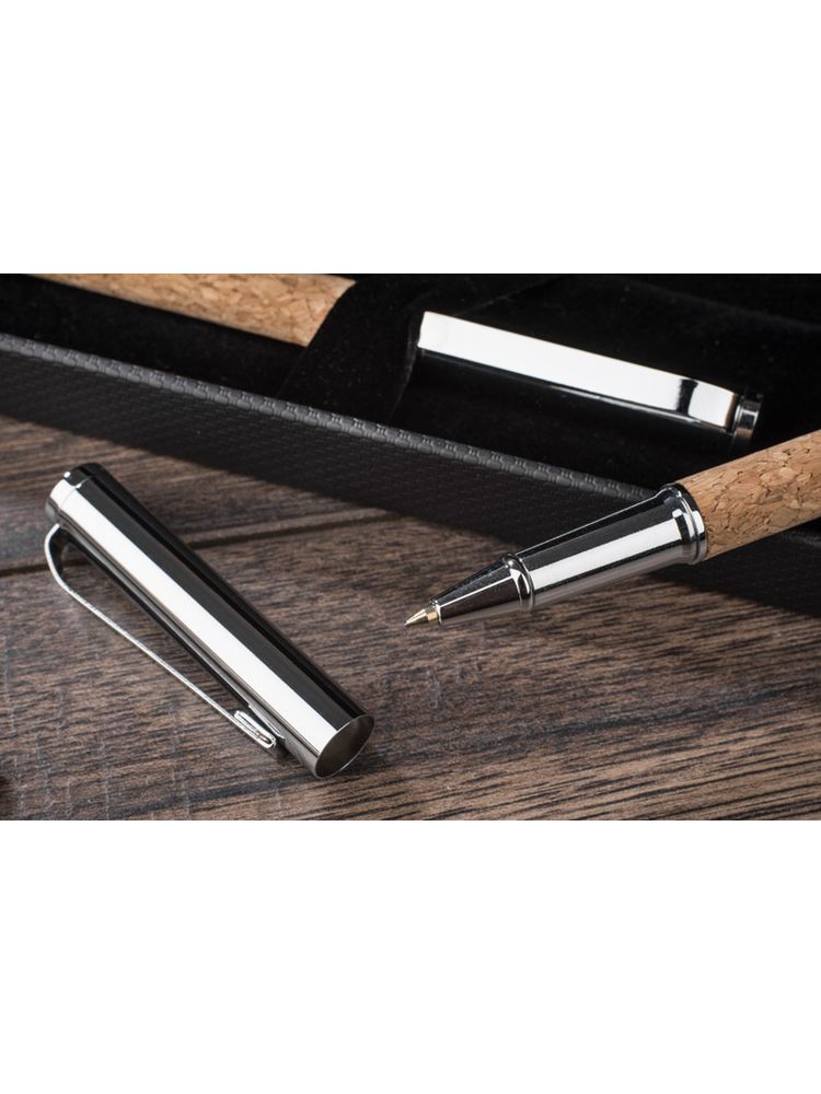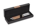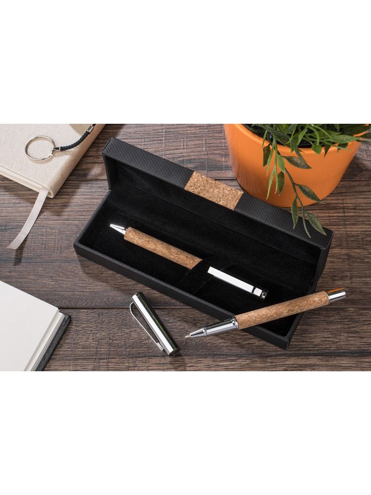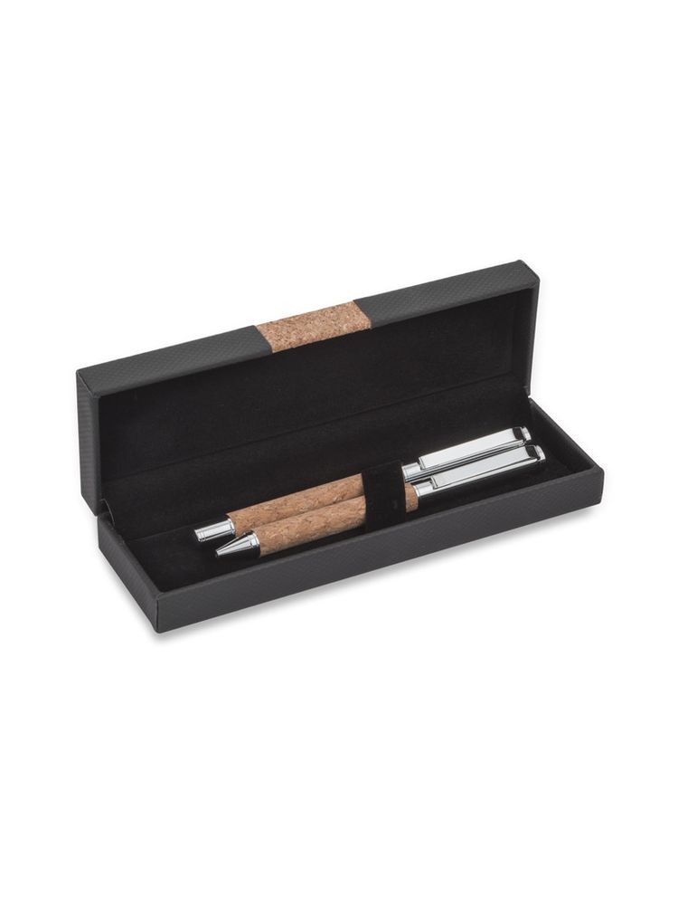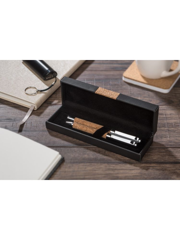 KANSAS to elegancki zestaw piśmienniczy dla miłośników naturalnych materiałów przyjaznych środowisku. W zestawie znajduje się długopis oraz pióro kulkowe wykonane z metalu oraz korka. Gustowne etui w kolorze czarnym ozdobione elementem korkowym. Długopis z mechanizmem typu twist, z czarnym wkładem, pióro kulkowe z zatyczką, z wkładem w kolorze czarnym.