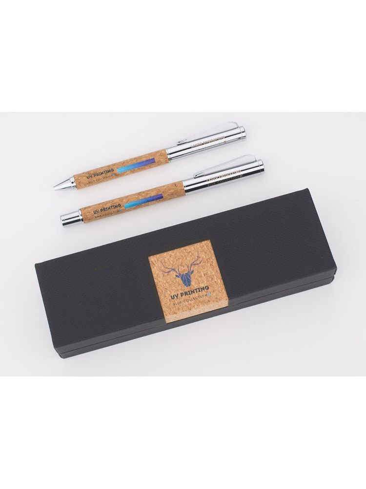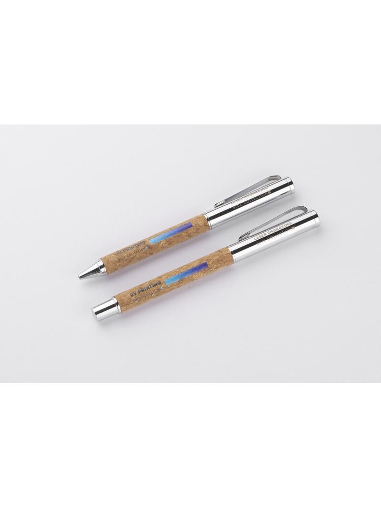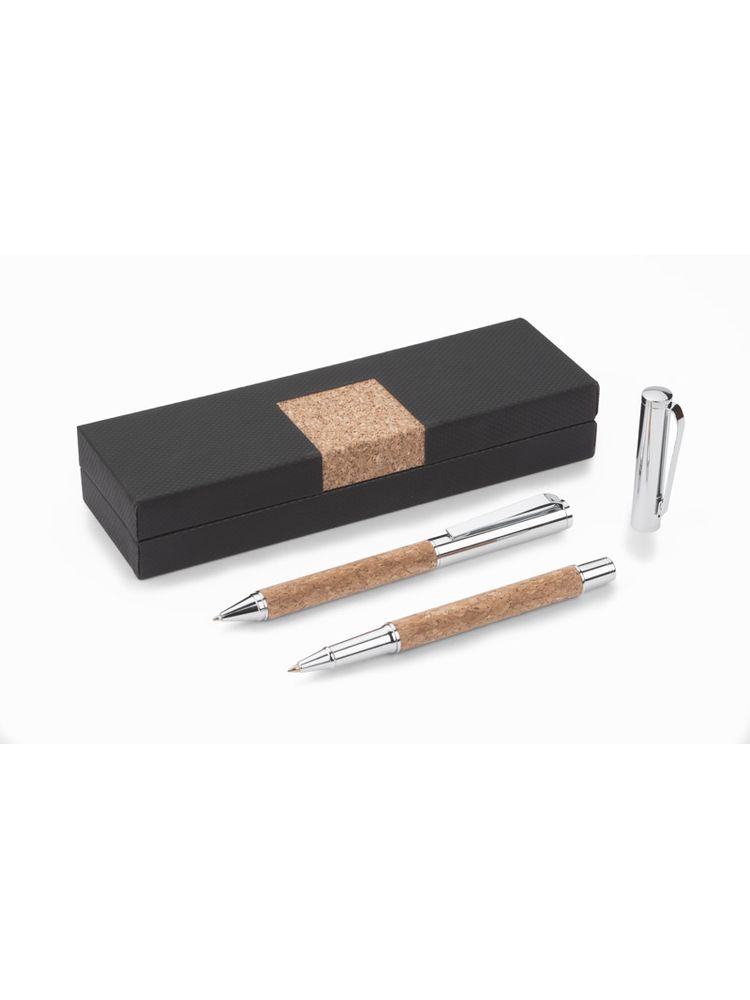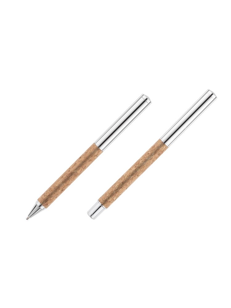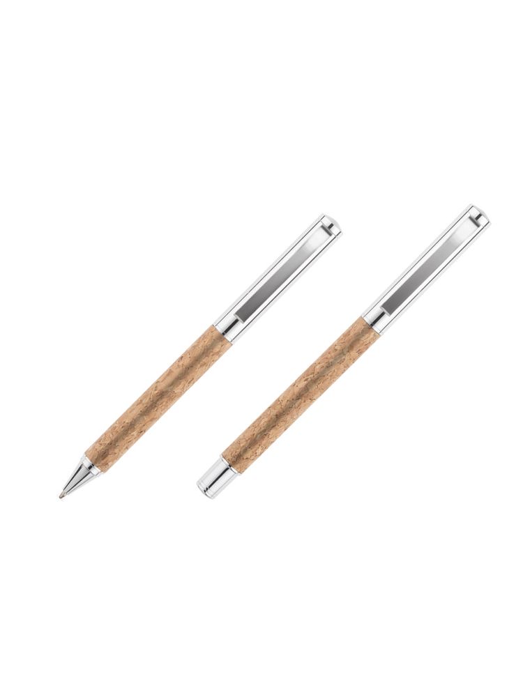 KANSAS to elegancki zestaw piśmienniczy dla miłośników naturalnych materiałów przyjaznych środowisku. W zestawie znajduje się długopis oraz pióro kulkowe wykonane z metalu oraz korka. Gustowne etui w kolorze czarnym ozdobione elementem korkowym. Długopis z mechanizmem typu twist, z czarnym wkładem, pióro kulkowe z zatyczką, z wkładem w kolorze czarnym.
