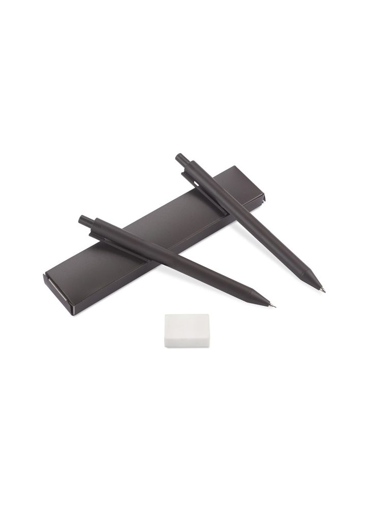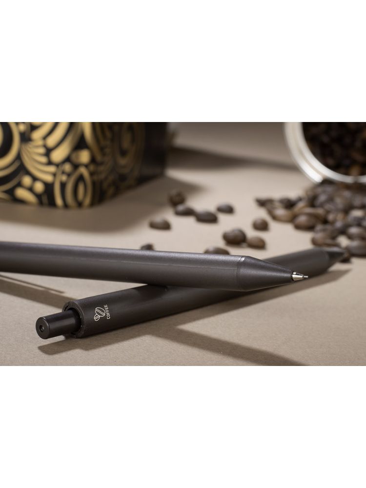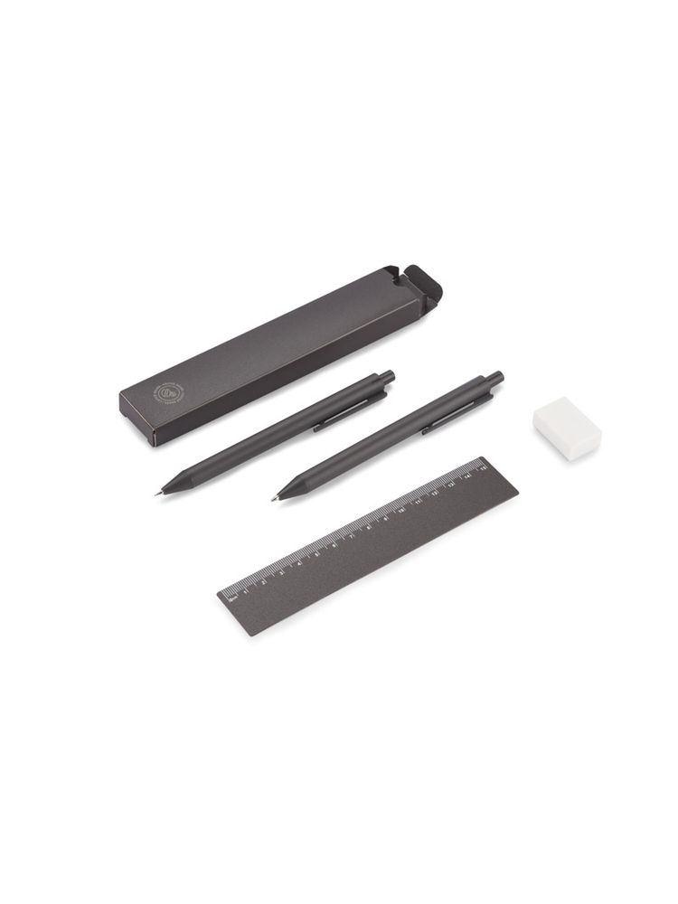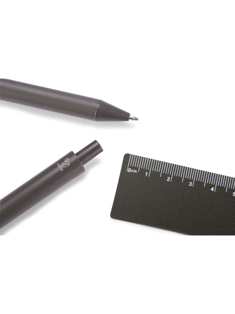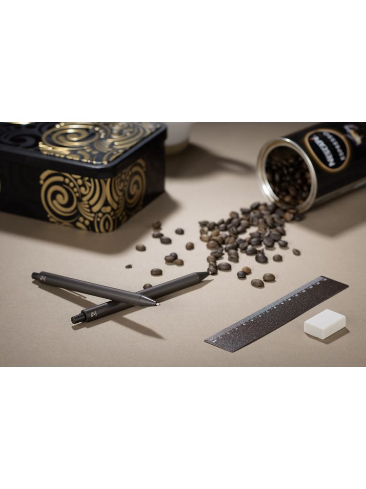 Zestaw KOPIKO składa się z długopisu, ołówka automatycznego oraz linijki wykonanych z tworzywa zawierającego w składzie ziarna kawy oraz klasycznej gumki do mazania.
