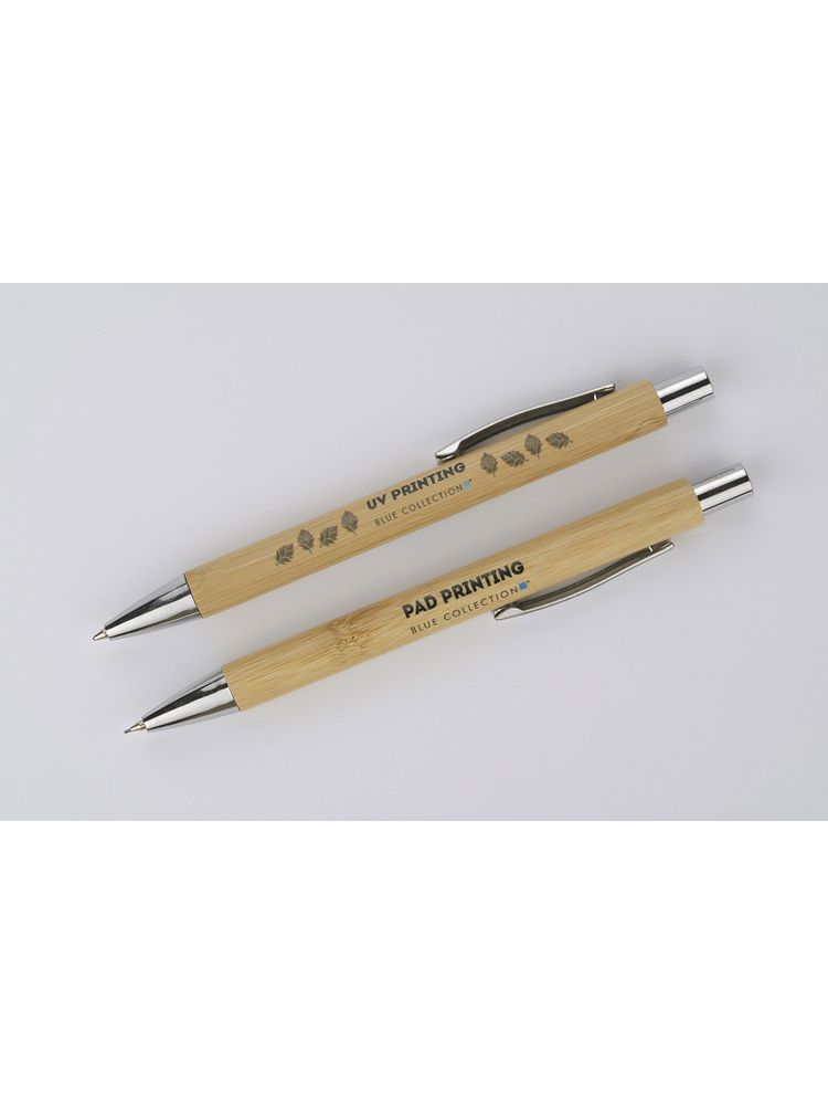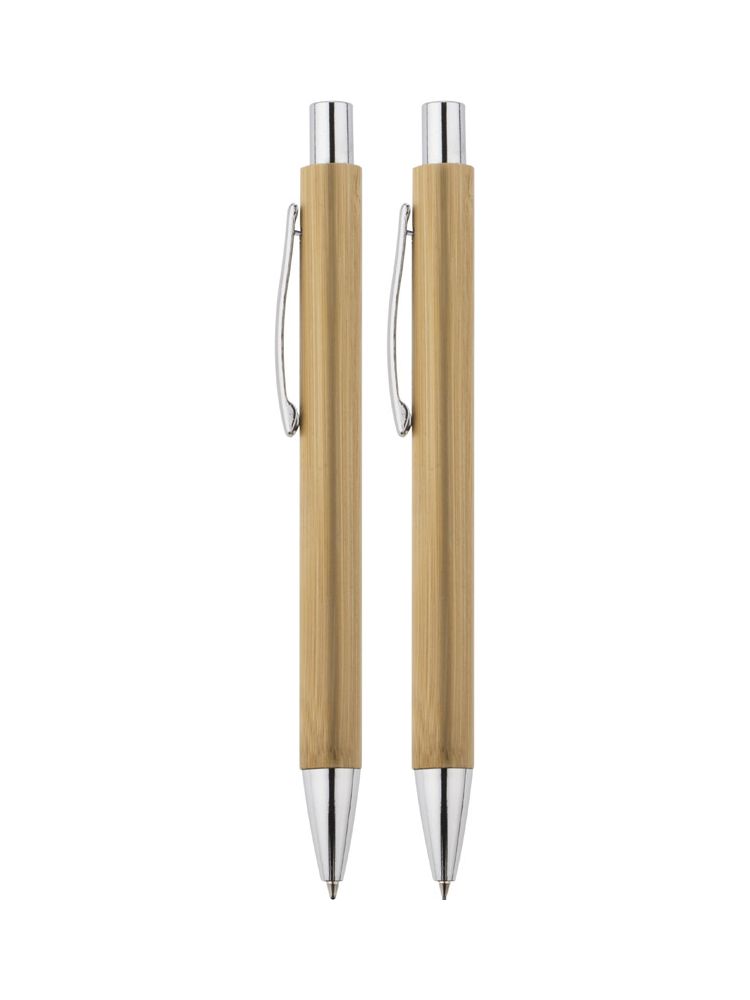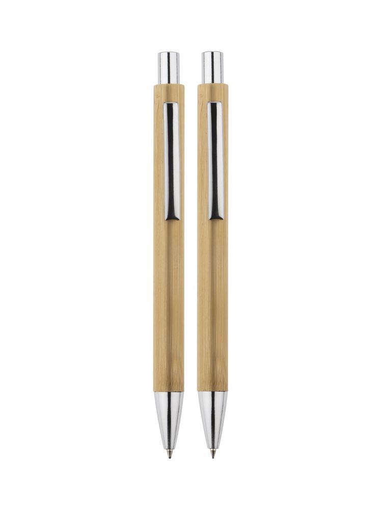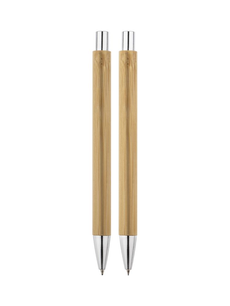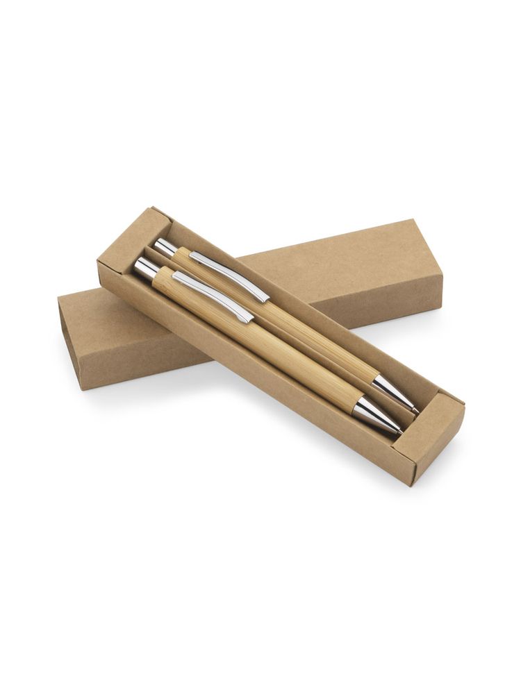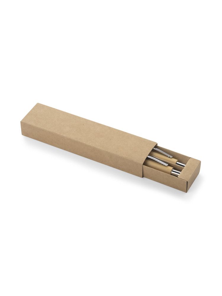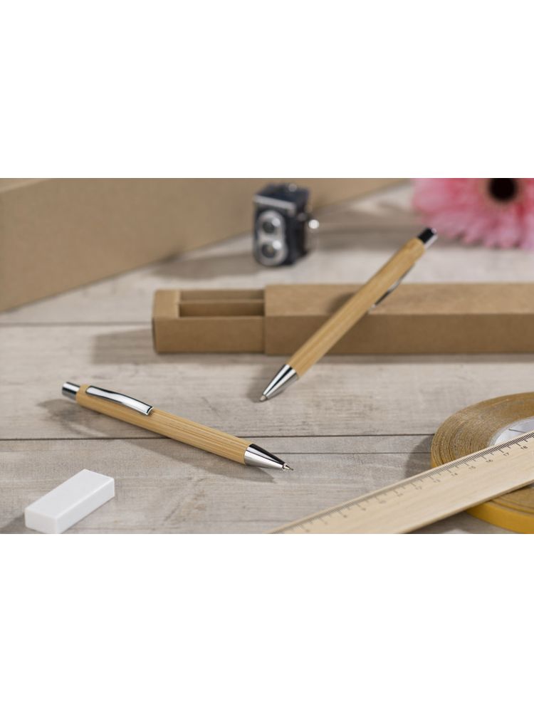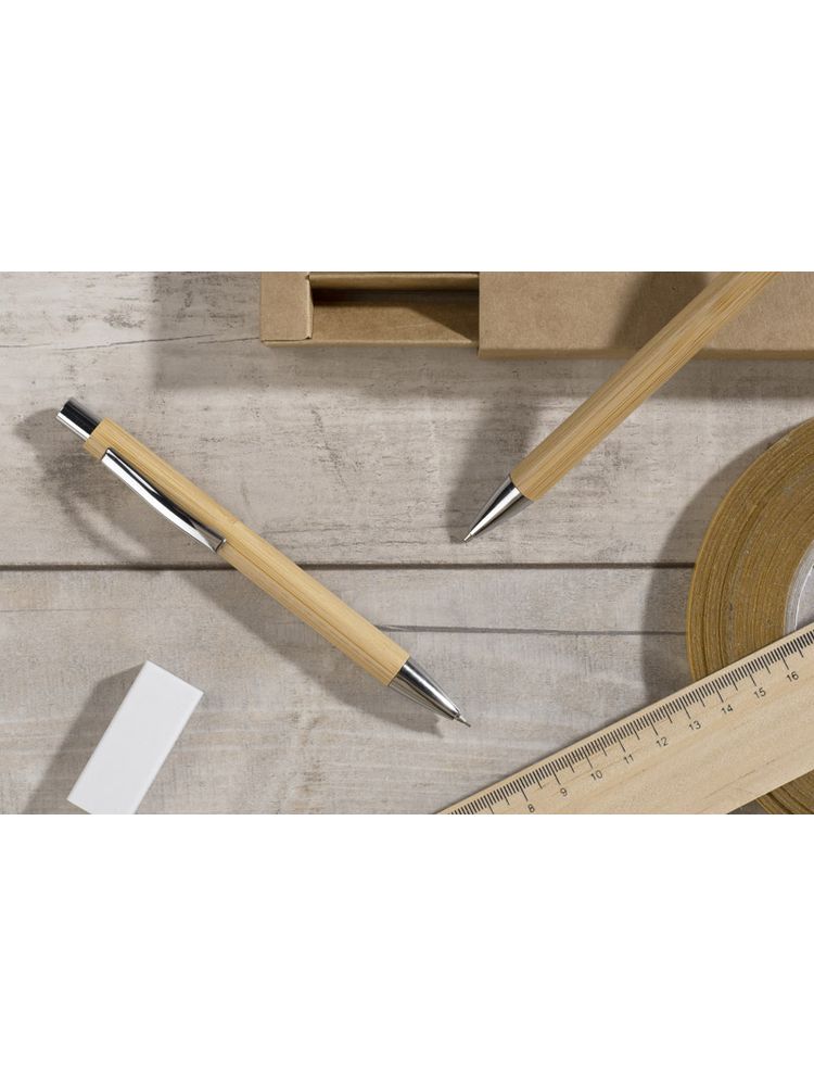 Zestaw piśmienniczy MAMBOO składa się z długopisu oraz ołówka automatycznego zapakowanych w brązowy, ekologiczny kartonik z tektury. Korpus długopisu i ołówka wykonany został z naturalnego bambusa. Chromowane wykończenia nadają mu elegancji. Wkład długopisu w kolorze niebieskim, ołówek automatyczny o grubości 0,7 mm.