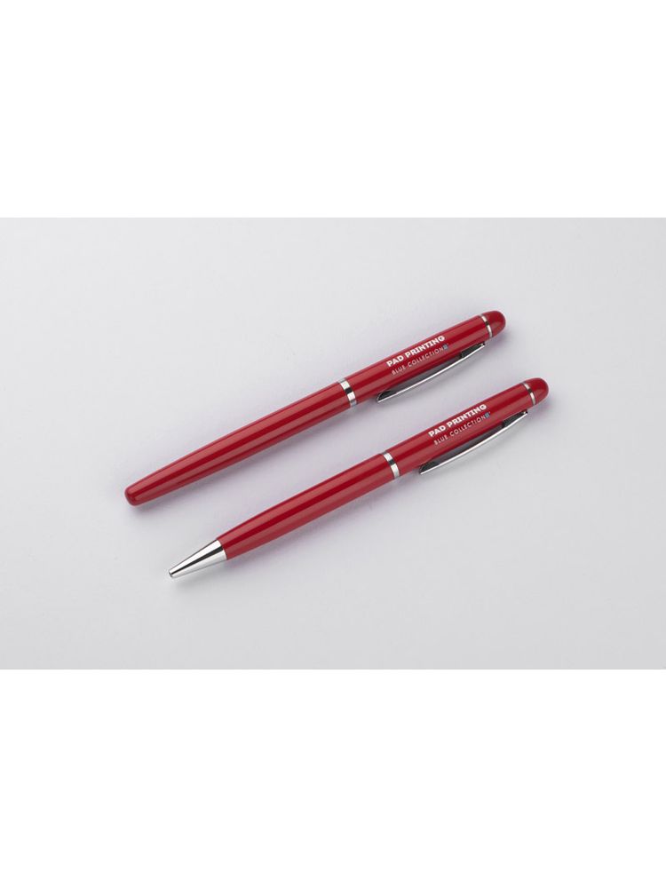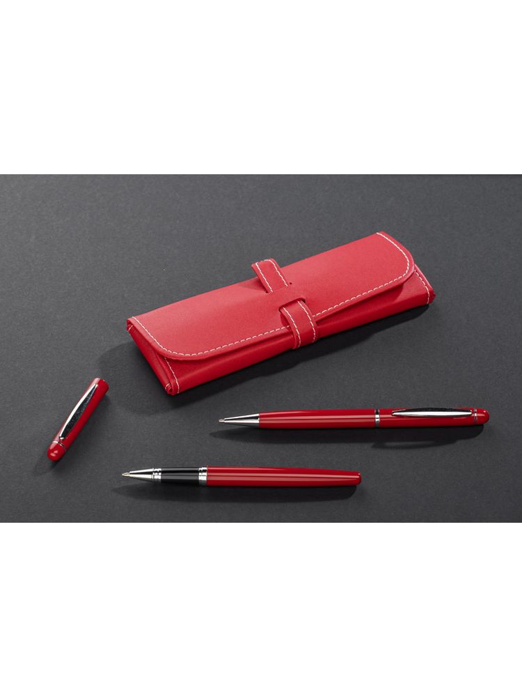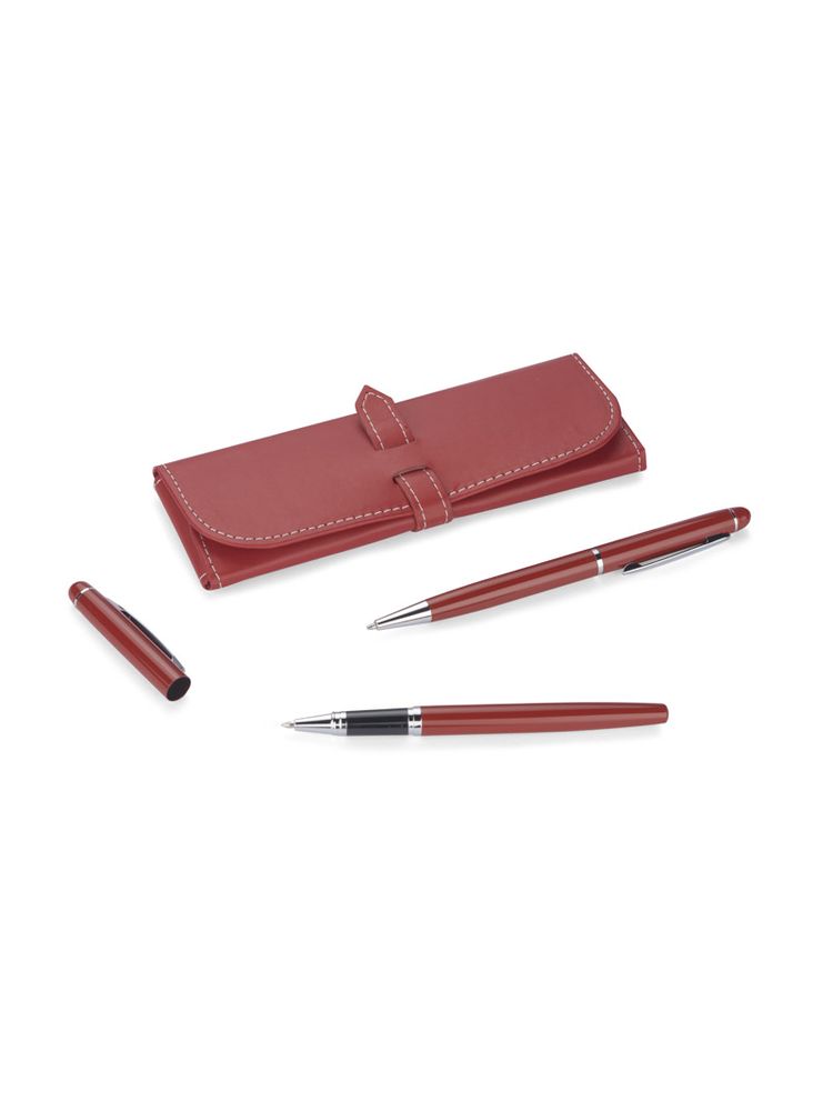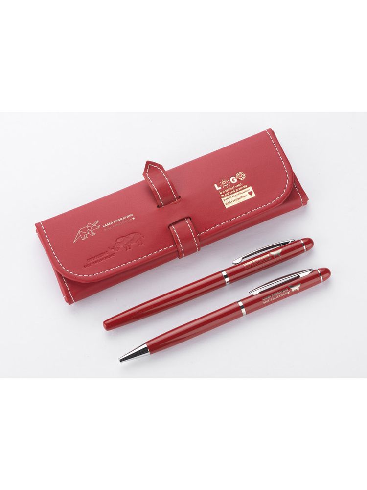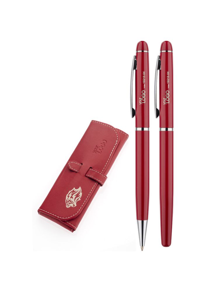 Elegancki zestaw piśmienniczy pakowany w etui z ekoskóry PU. W zestawie znajdują się długopis oraz pióro kulkowe. Logo wygrawerujemy na powierzchni artykułów piśmienniczych. Możliwość wygrawerowania logo także na etui.