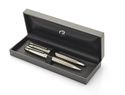 Elegancki zestaw prestiżowej marki GESSTOR cechującej produkty wysokiej jakości o unikatowym wzornictwie. Czarne pudełko zawiera długopis oraz pióro kulkowe w kolorze grafitowym. Oba elementy wykonane są w całości z metalu, w dolnej części ozdobione ciekawą fakturą kratki. Elementy posiadają oznaczenie marki Gesstor na końcówkach. Znakowanie jest możliwe na długopisach oraz na pudełku.