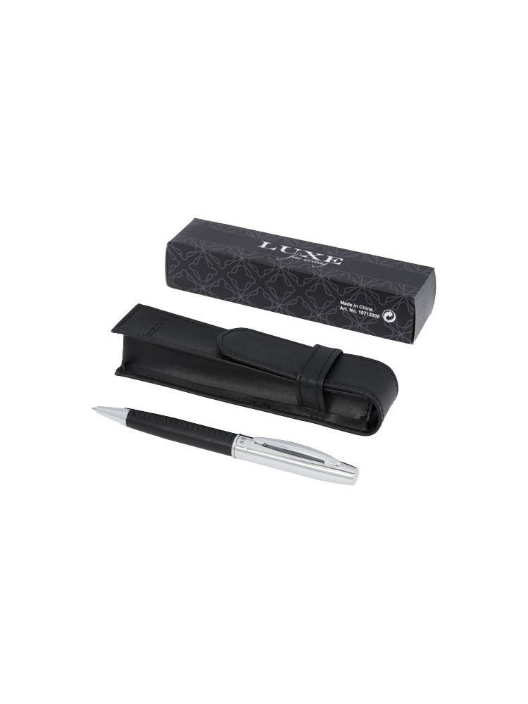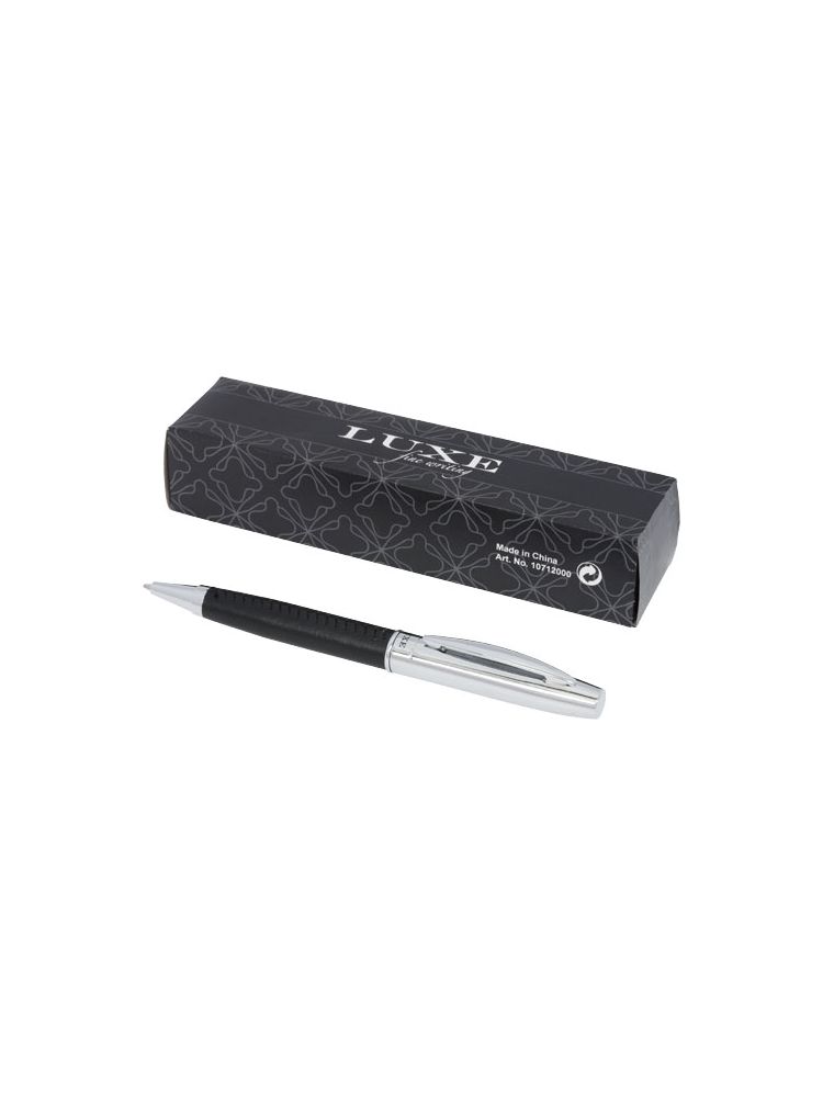 Objęty wzorem zastrzeżonym długopis z korpusem owiniętym imitacją skóry, z etui z imitacji skóry, wszystko zapakowane w pudełko upominkowe „Luxe”.