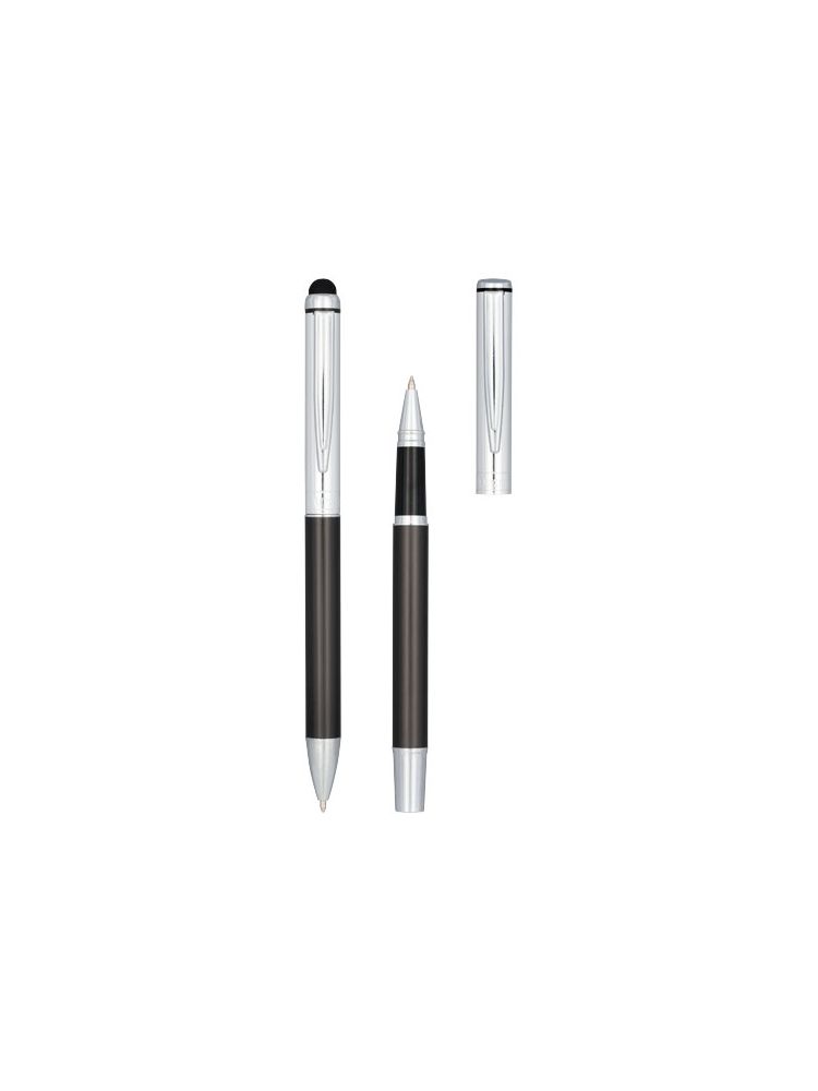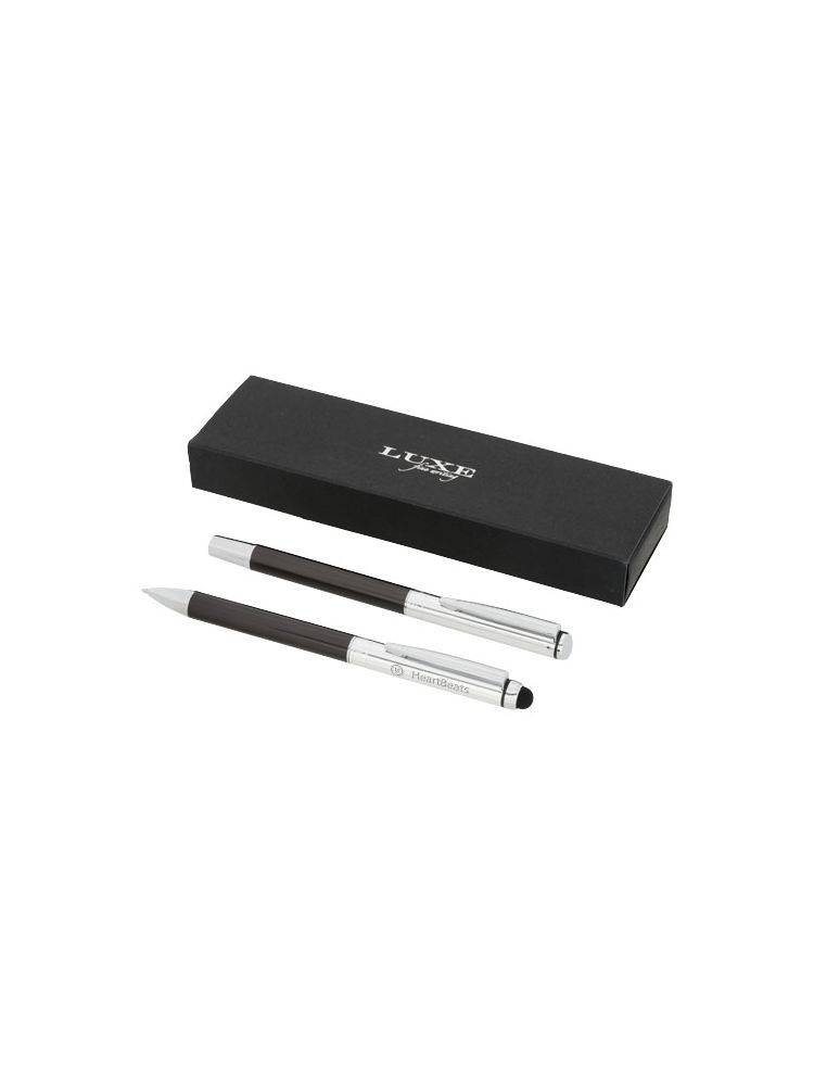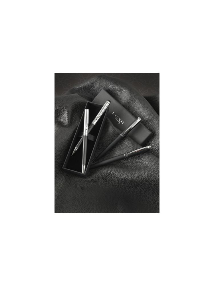 Objęty wzorem zestaw piśmienniczy złożony z długopisu ze stylusem i pióra kulkowego. Długopis i pióro kulkowe mają grafitową dolną część korpusu i chromowaną górną część korpusu. W zestawie wkład premium z czarnym tuszem i stylus z gumowaną końcówką, idealny do urządzeń z ekranem dotykowym – tabletów i smartfonów. Zapakowane w pudełko upominkowe „LUXE” (17×5,5×3 cm).