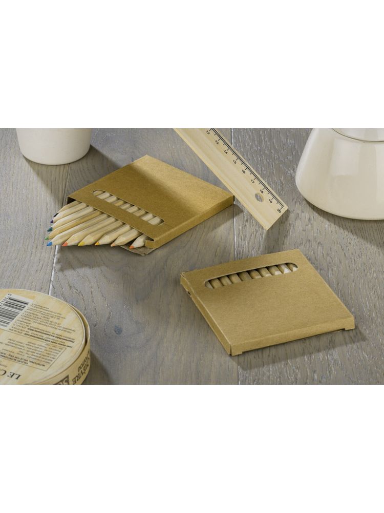 Drewniane kredki w dwunastu kolorach. Zapakowane w poręczny kartonik z okienkiem. Logo nadrukujemy na kartoniku.