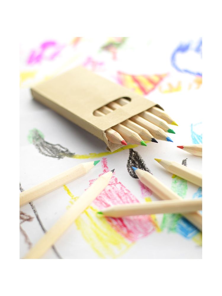 Drewniane kredki w sześciu kolorach. Zapakowane w poręczny kartonik z okienkiem. Logo nadrukujemy na kartoniku.