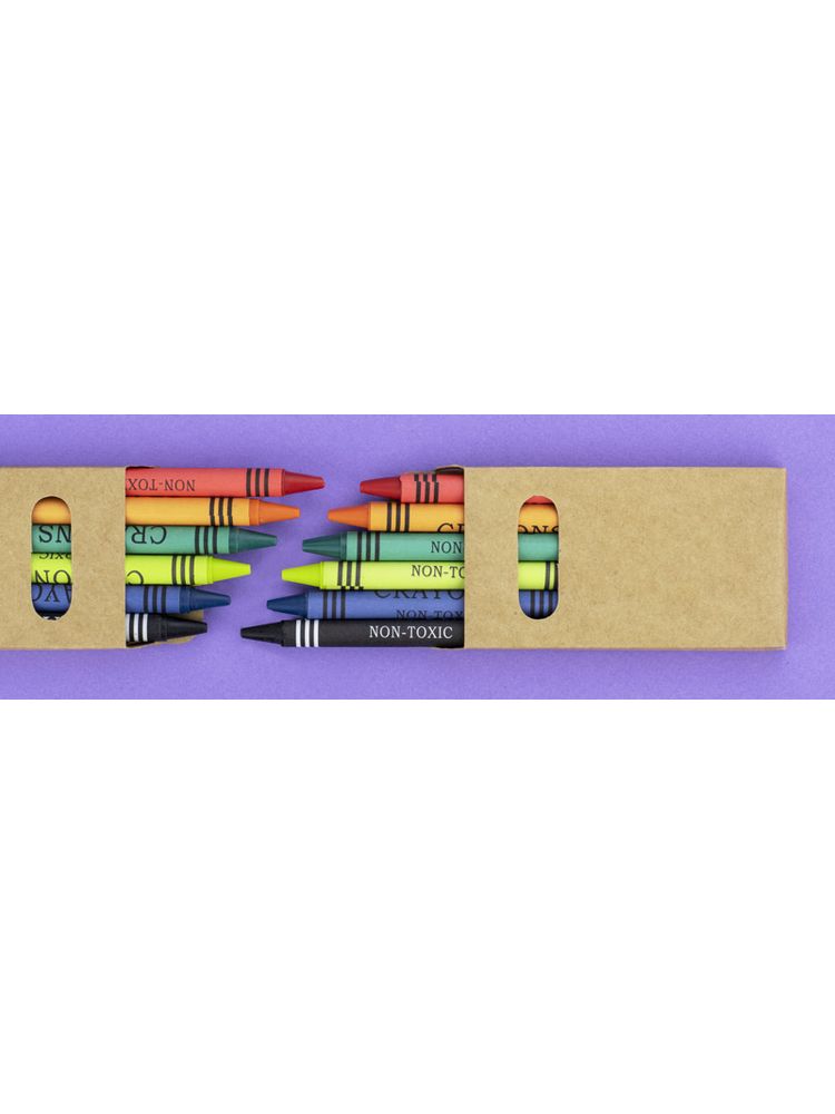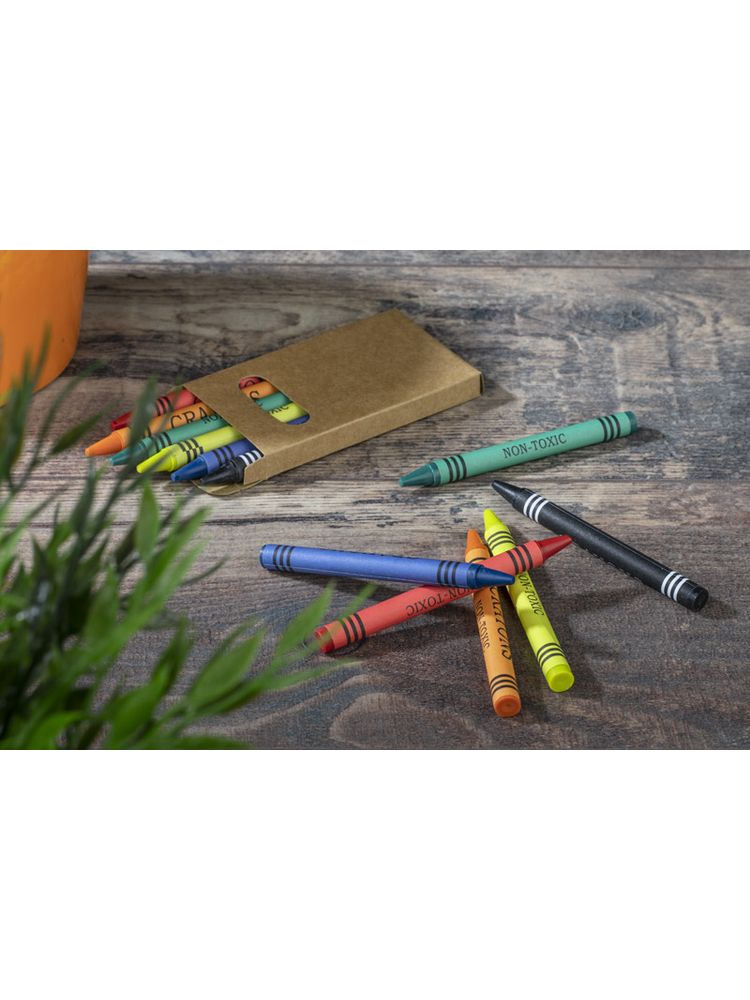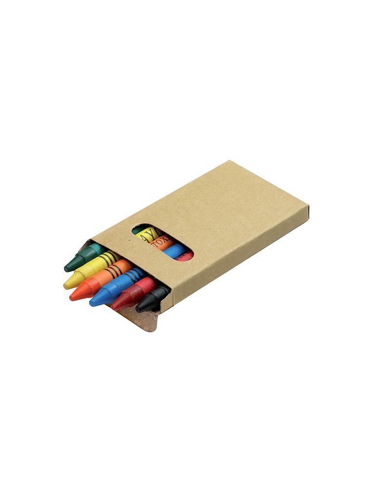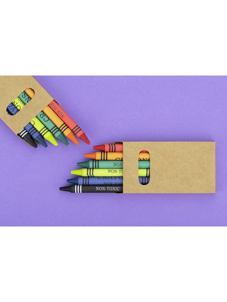 Kredki świecowe w sześciu kolorach, zapakowane w ekologiczny kartonik z okienkiem. Logo nadrukujemy na kartoniku.