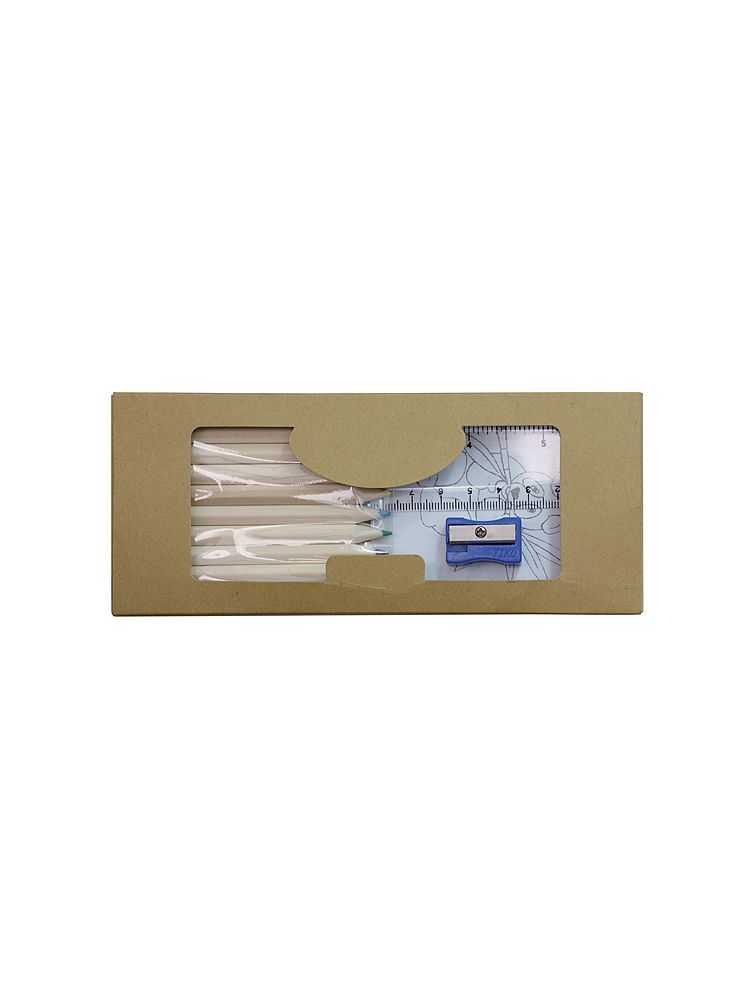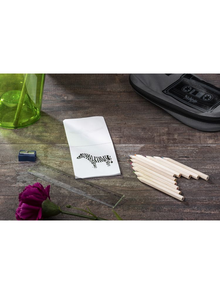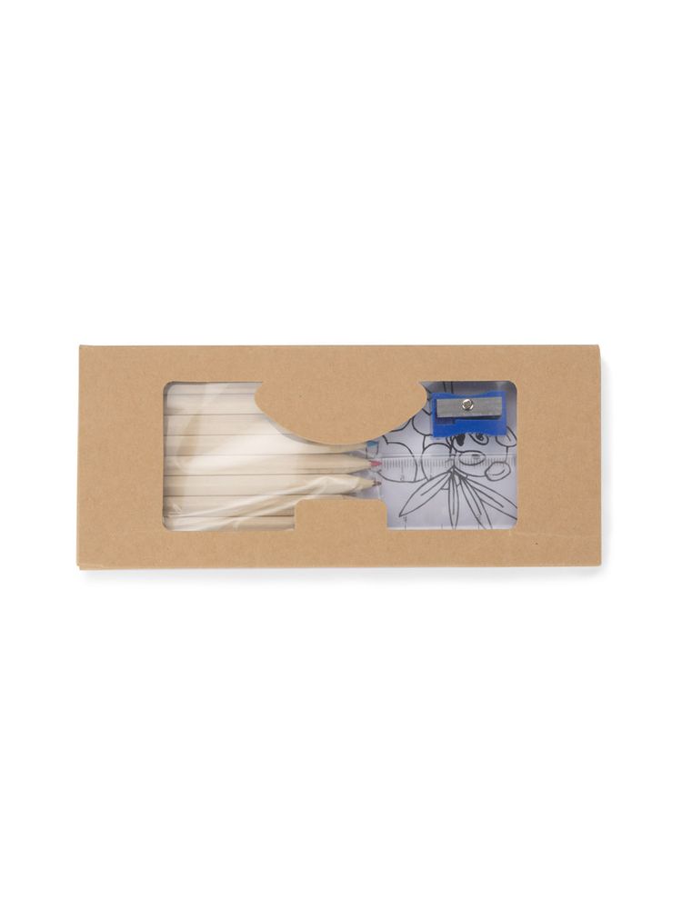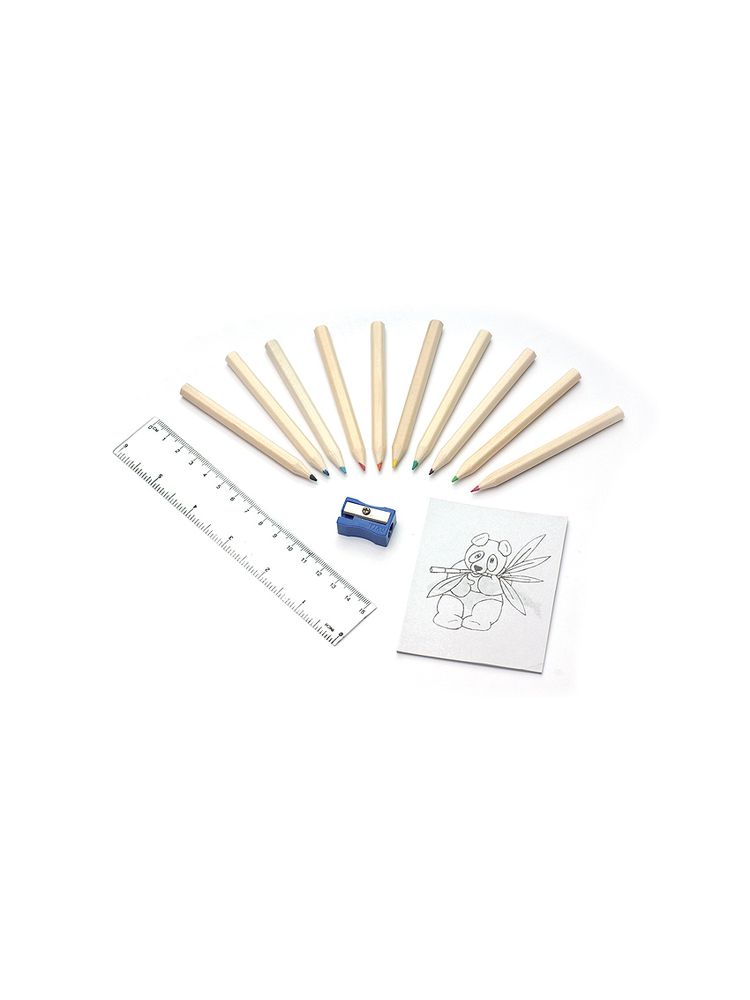 Zestaw małego artysty zawierający kolorowankę, dziesięć drewnianych kredek, linijkę oraz temperówkę. Logo nadrukujemy na kartoniku.
