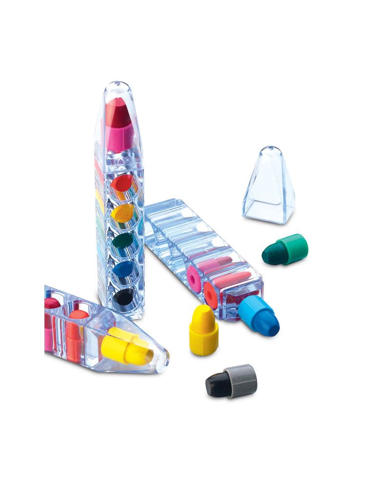 Komplet 6 kredek świecowych w przezroczystym pojemniku w kształcie ołówka.