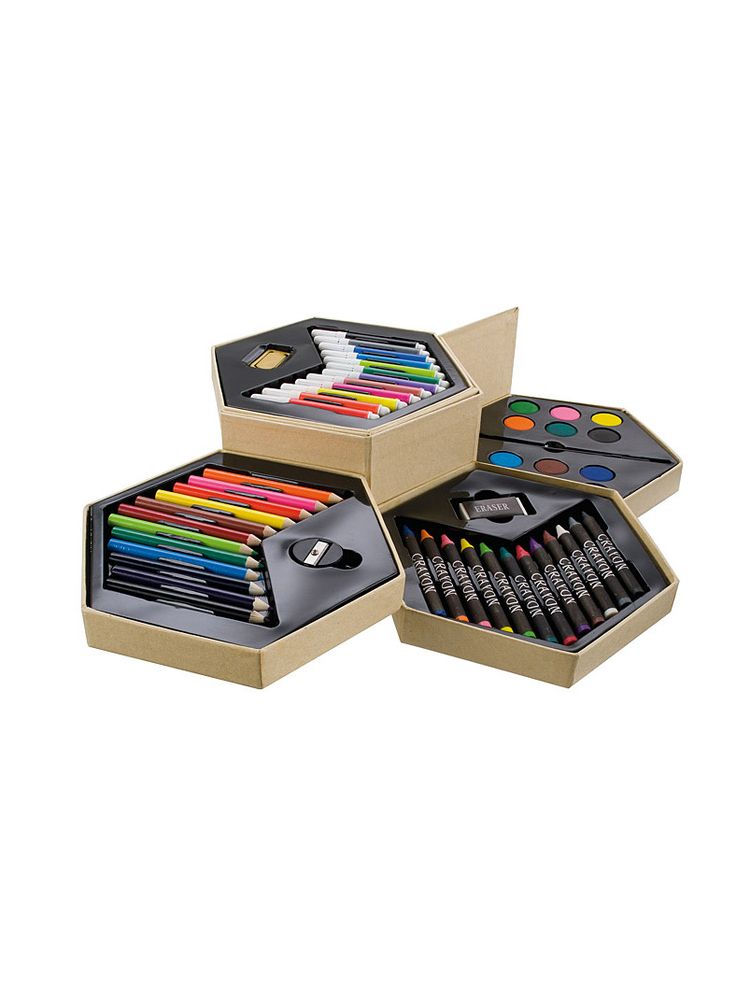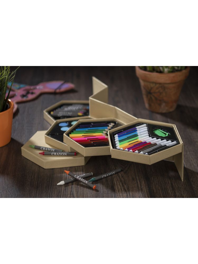 Bogaty zestaw malarski w którego skład wchodzą kredki drewniane, pisaki, farbki oraz kredki świecowe. Całość zapakowana w ekologiczny karton. Zapewni fantastyczną zabawę najmłoszym. Nadruk logo na pudełku.