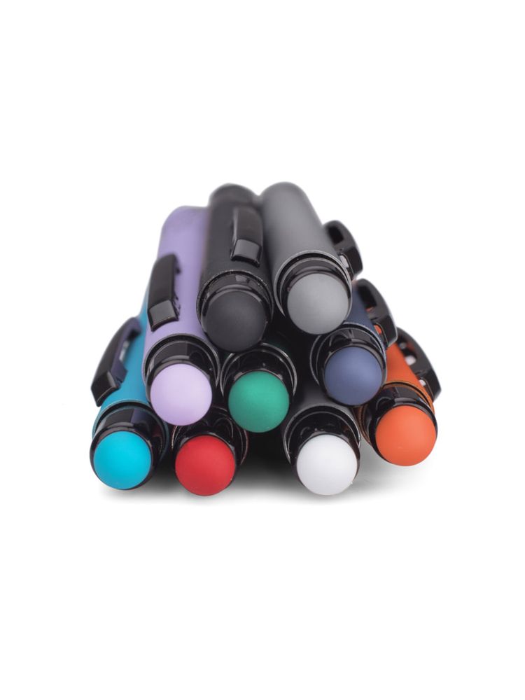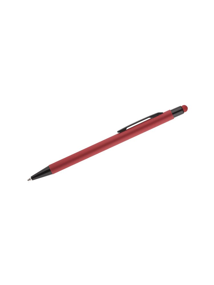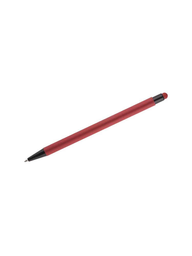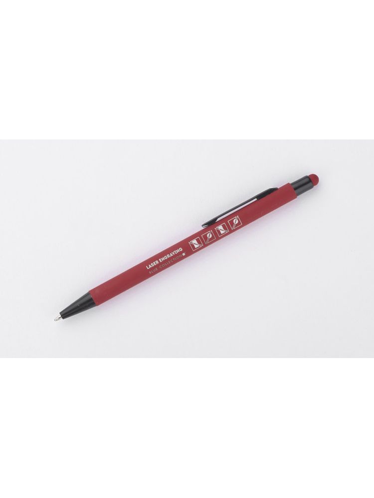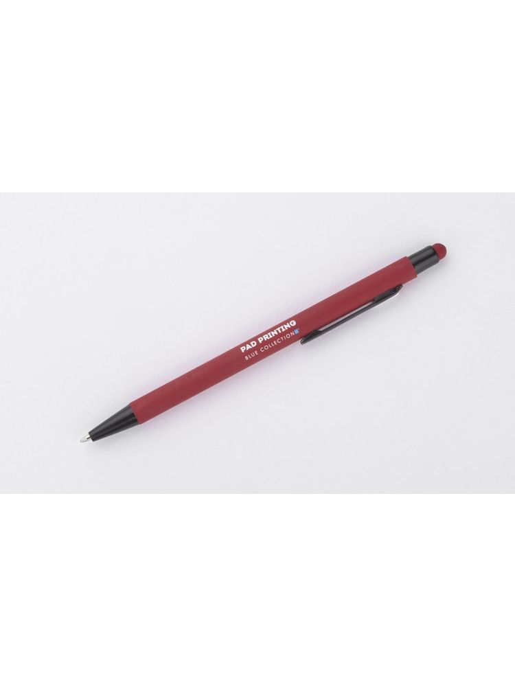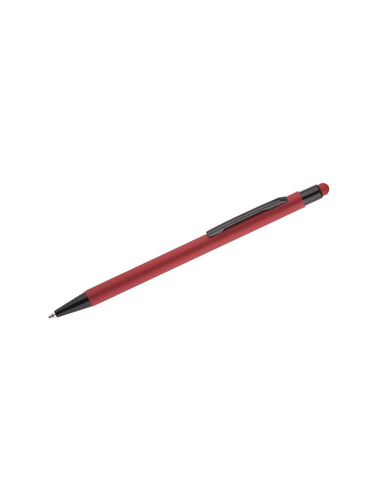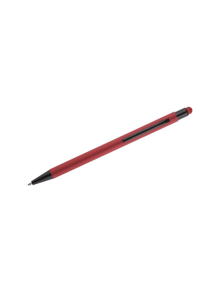 Klasyczny, cienki długopis PRIM wykonany z aluminium pokrytego gumowaną powłoką typu soft touch. Na górze końcówka do obsługi ekranów dotykowych w kolorze dopasowanym do korpusu długopisu. Wykończenia w kolorze czarnym. Długopis automatyczny. Wkład typu X20 w kolorze niebieskim.