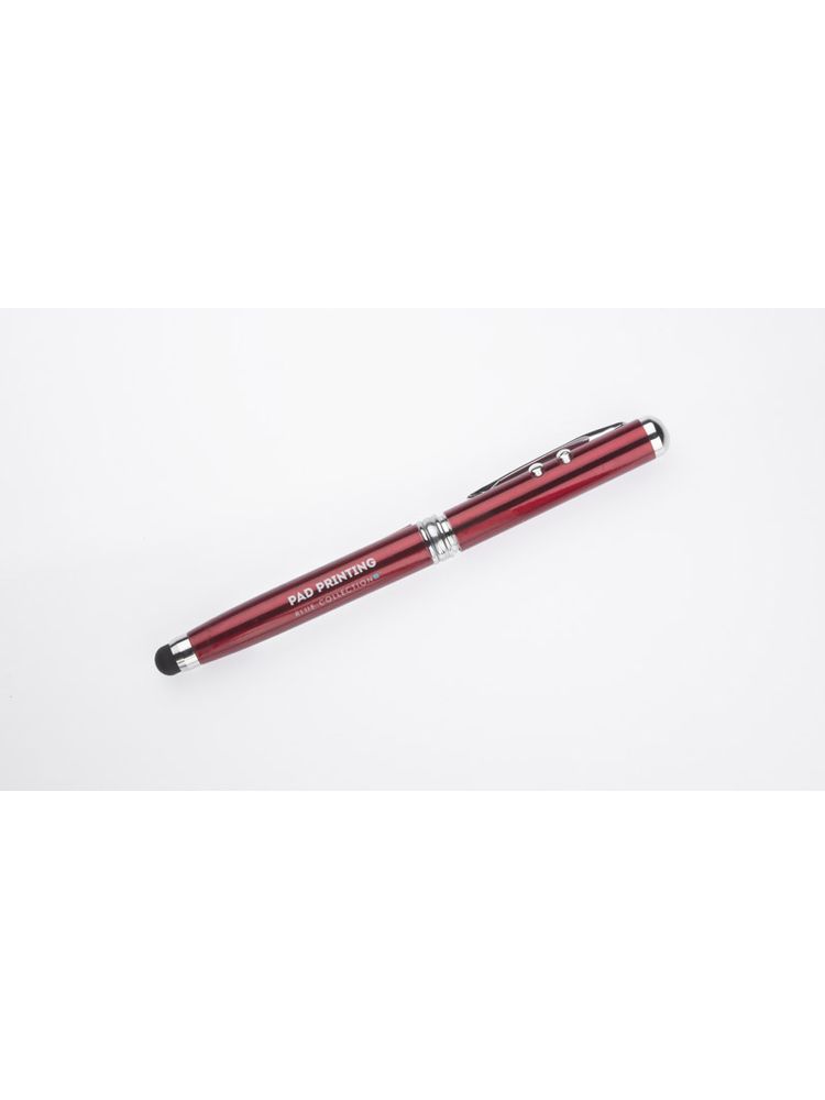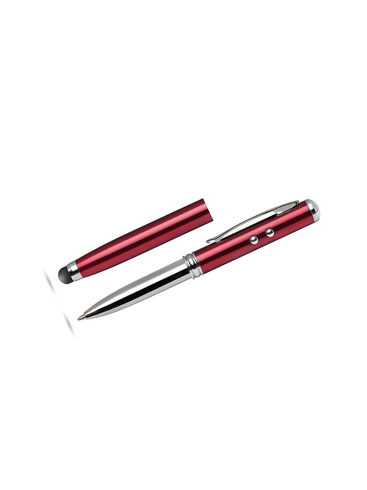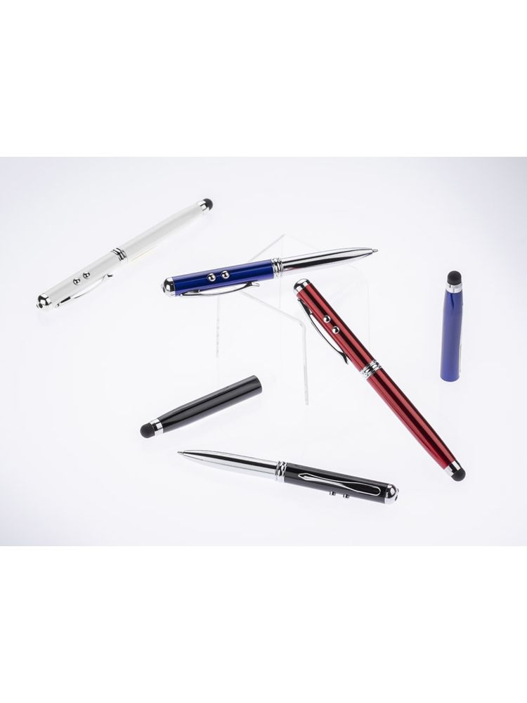 Długopis wykonany z metalu łączący aż cztery praktyczne funkcje: długopis, touch pen, wskaźnik laserowy, latarka. W jednym przyrządzie mieści się wszystko czego można potrzebować w czasie prezentacji multimedialnej lub innych biznesowych spotkań. Zgodnie z dyrektywą Unii Europejskiej (2006/25/EU) i Normą Polska ( PN-EN 60825-1:2005) wskaźnik posiada naklejkę informującą o niebezpieczeństiwe użytkowania. Logo wygrawerujemy.