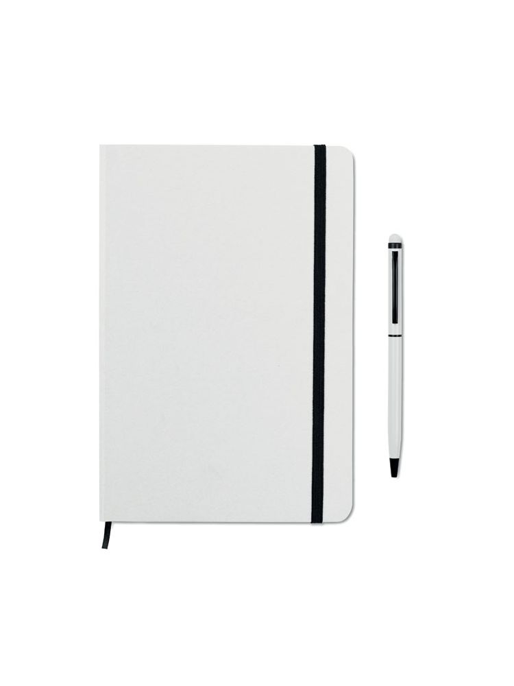 Notes A5 z długopisem z rysikiem 2 w 1. Twarda okładka. 144 strony w linie (72 kartki). Pasujący długopis z rysikiem do ekranów dotykowych. Niebieski tusz. Dopasowany elastyczny pasek zamykający i zakładka z tasiemki.