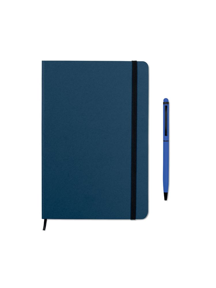 Notes A5 z długopisem z rysikiem 2 w 1. Twarda okładka. 144 strony w linie (72 kartki). Pasujący długopis z rysikiem do ekranów dotykowych. Niebieski tusz. Dopasowany elastyczny pasek zamykający i zakładka z tasiemki.