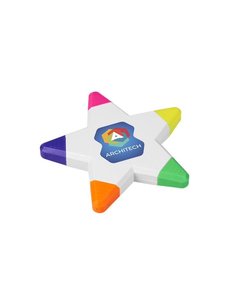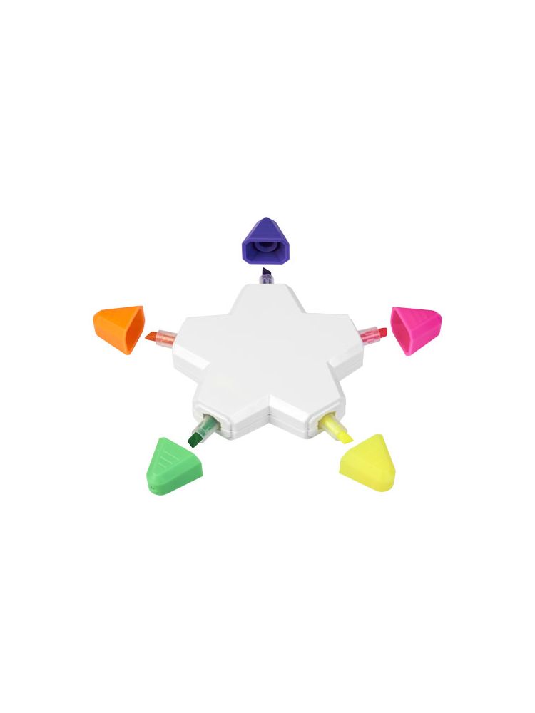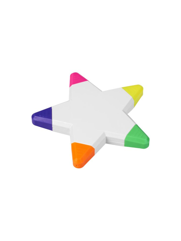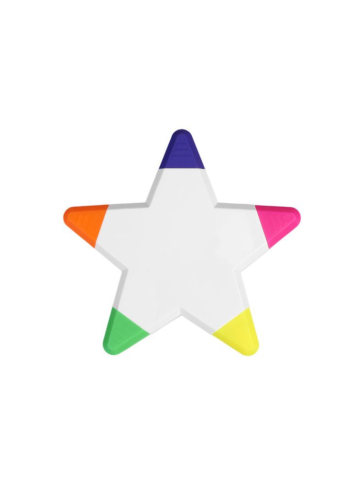 Pięć zakreślaczy w żywych kolorach w kształcie gwiazdy. Ostrzeżenie! Nieodpowiednie dla dzieci poniżej trzeciego roku życia. Małe części. Ryzyko zadławienia.