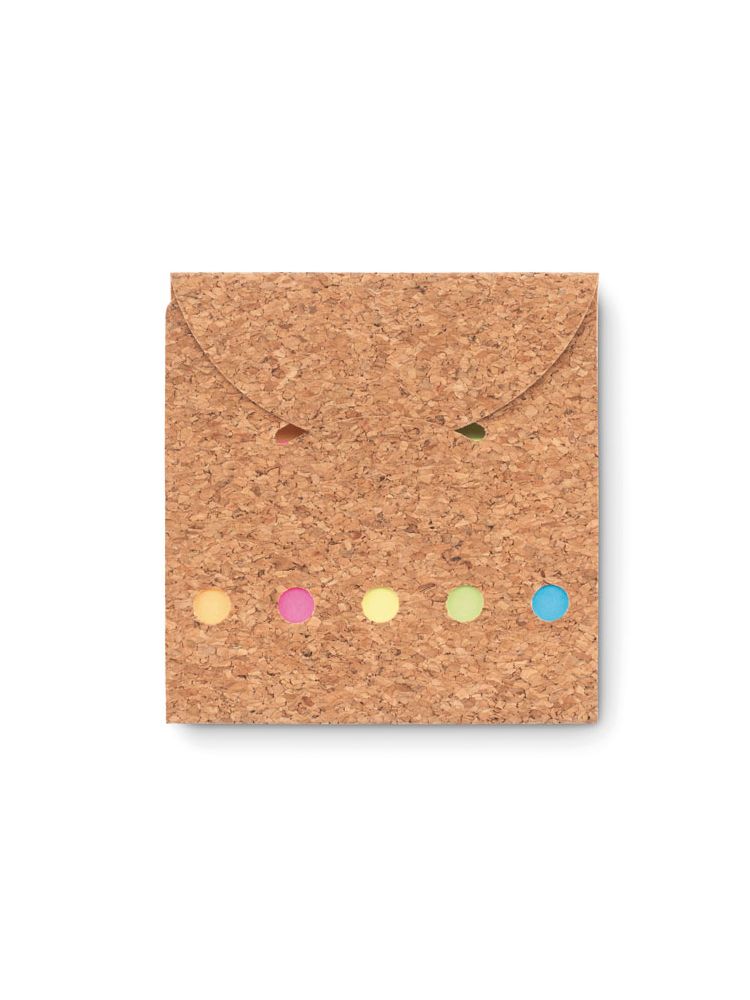 Karteczki samoprzylepne z korkową kopertą. 125 arkuszy dużych żółtych karteczek samoprzylepnych i 25 arkuszy 5 różnokolorowych znaczników do notatek. Korek jest materiałem w 100% naturalnym. Ze względu na jego strukturę i porowatość powierzchni ostateczny wygląd nadruku na każdym artykule może się różnić.
