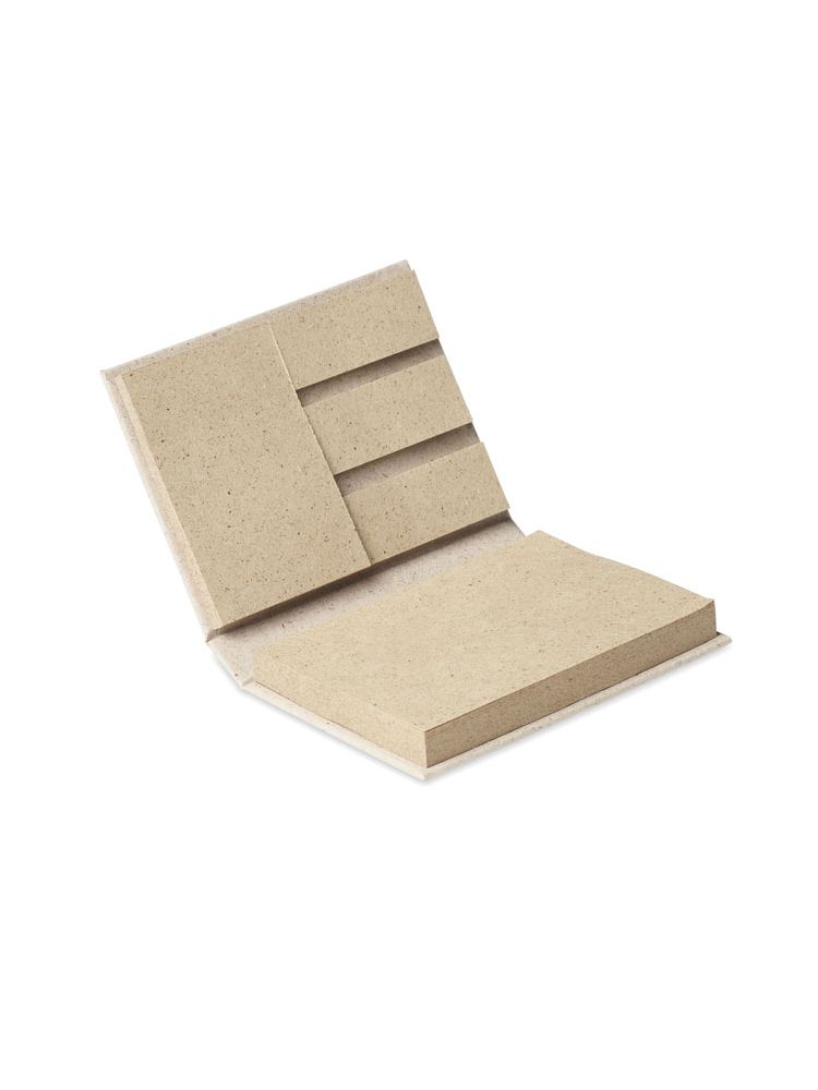 Notesik i karteczki samoprzylepne. Duże i średnie karteczki samoprzylepne oraz 3 znaczniki stron. 70 arkuszy papieru trawiastego (95 g/m²). Papier trawiasty zawiera 40% włókien trawiastych.