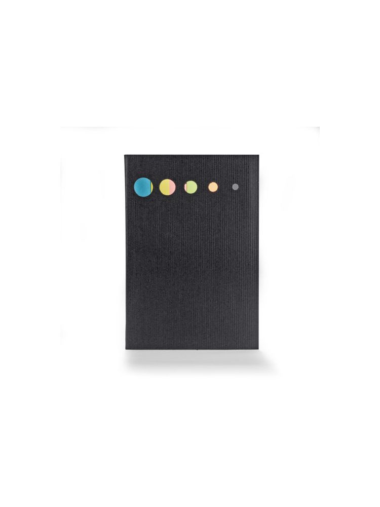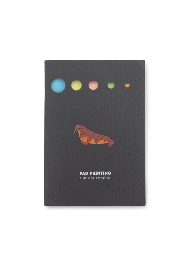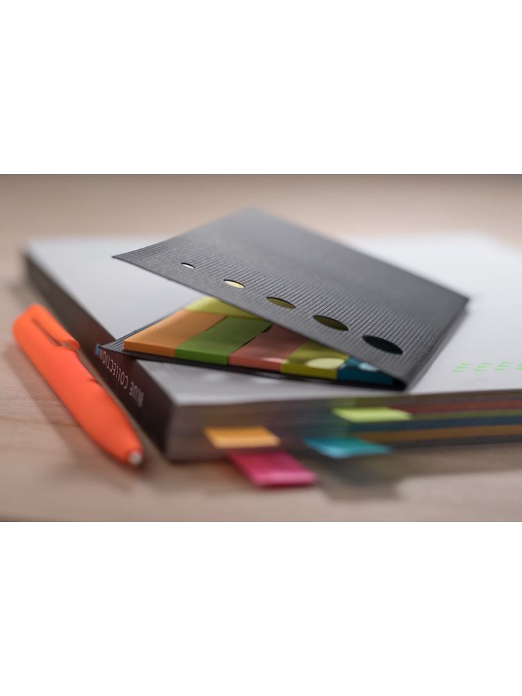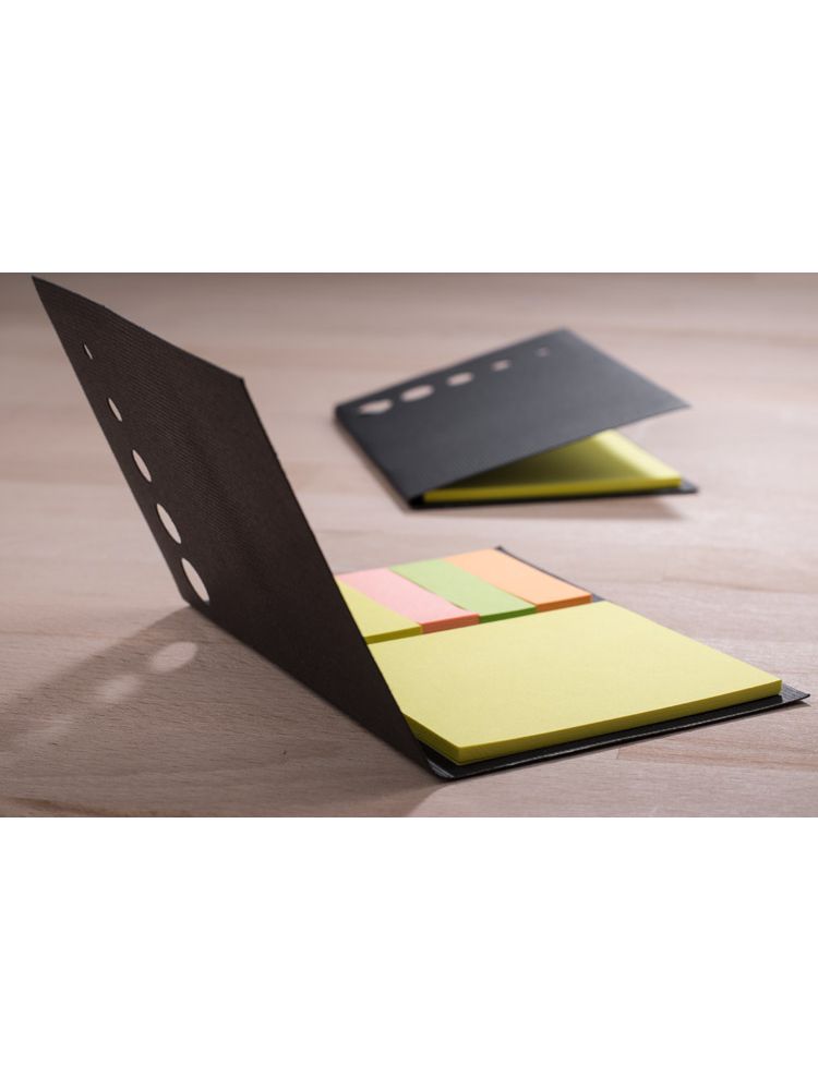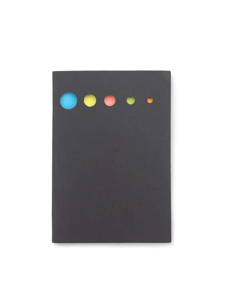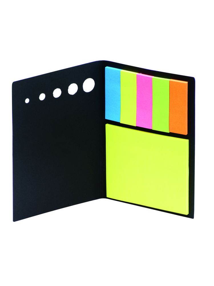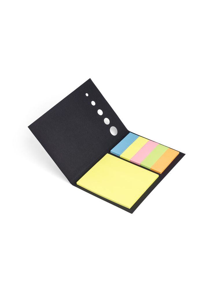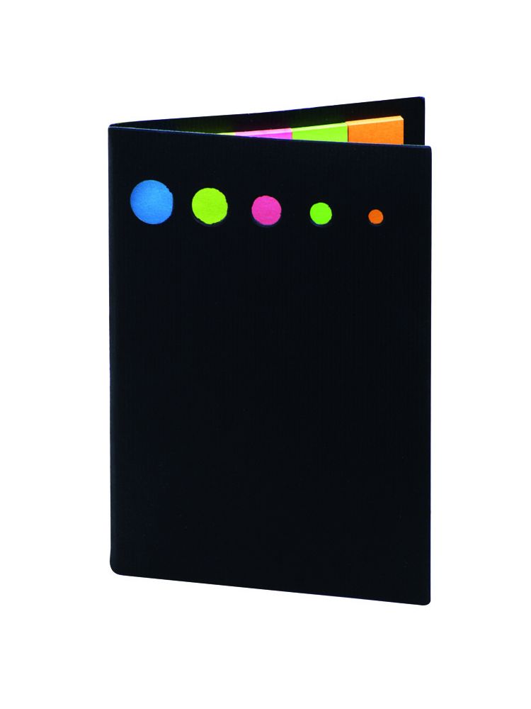 Karteczki samoprzylepne w pięciu kolorach oraz samoprzylepny notesik, umieszczone w czarnej okładce. Logo nadrukujemy na etui metodą tampodruku.