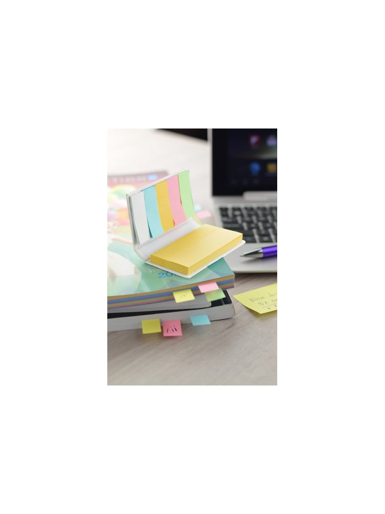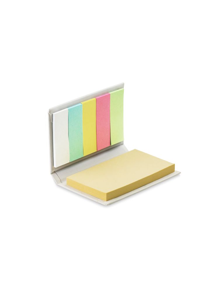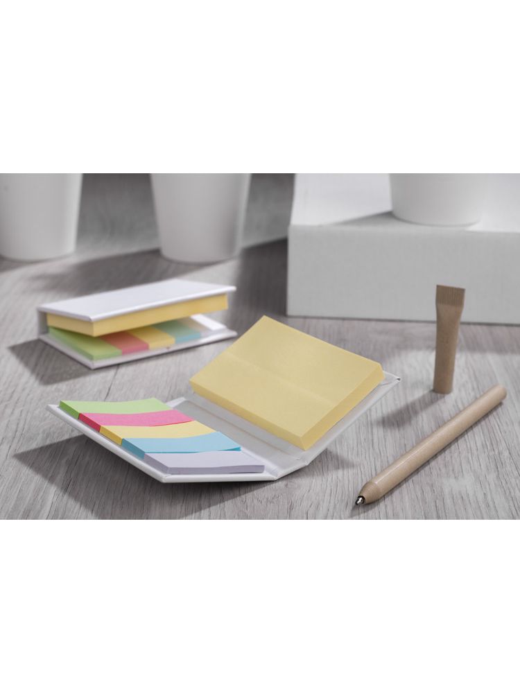 Mały, podręczny notesik z kompletem karteczek samoprzylepnych. Zawiera 5 kolorów małych karteczek po 25 szt./kolor oraz 70 szt. duzych karteczek. Nadruk logo wykonamy na notesiku.