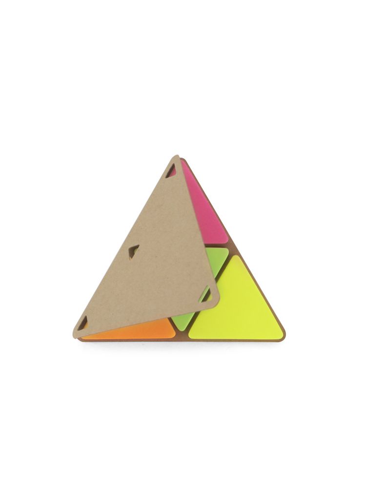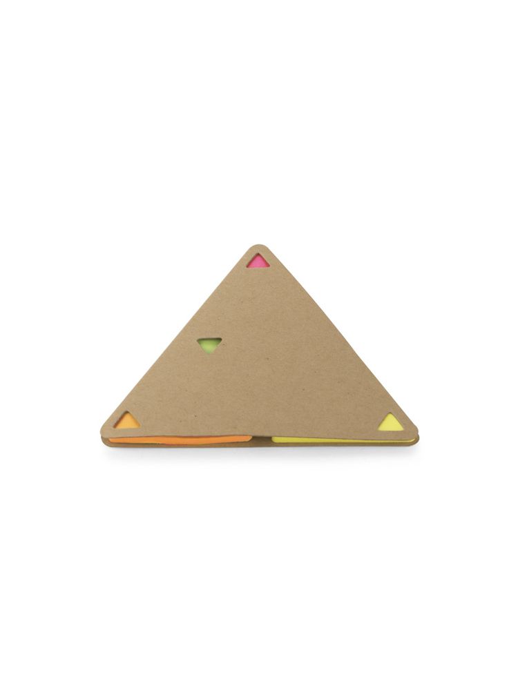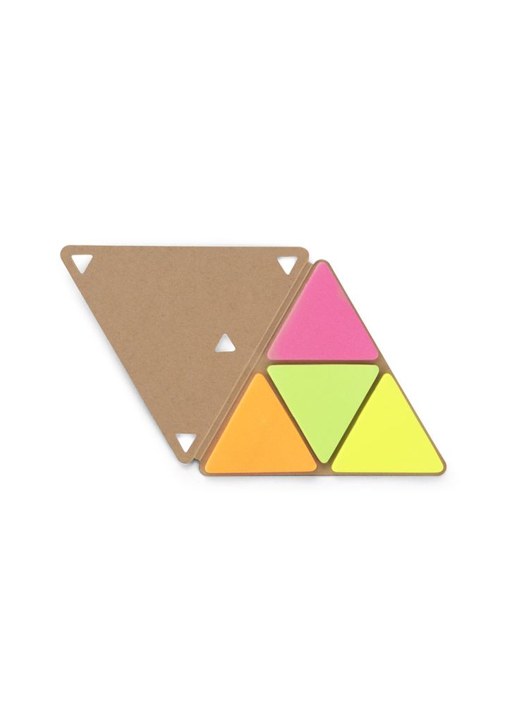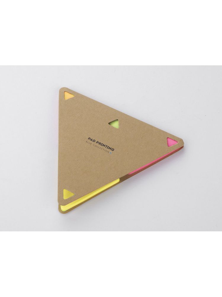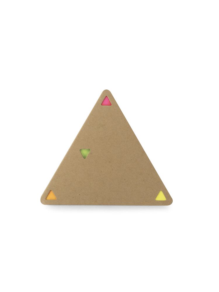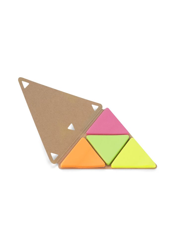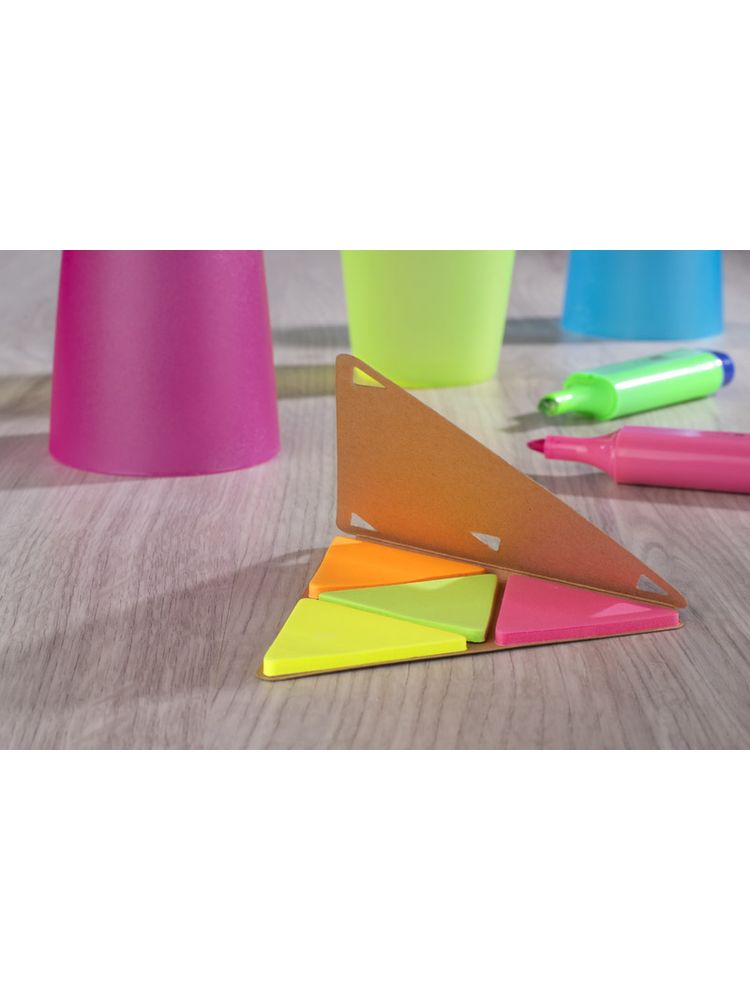 Karteczki samoprzylepne PEL w kształcie trójkąta z ekologiczną papierową okładką. Wewnątrz znajduje się 25 sztuk karteczek w 4 kolorach: pomarańczowym, różowym, zielonym, żółtym.