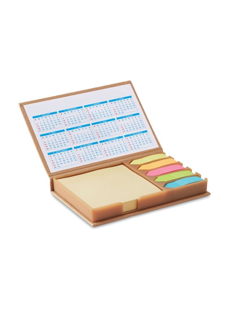 Zestaw notatek na biurko z kalendarzem. Duże żółte karteczki samoprzylepne z papieru z recyklingu. 5 różnokolorowych markerów ze strzałkami. 4-letni kalendarz na wewnętrznej stronie pokrywy.