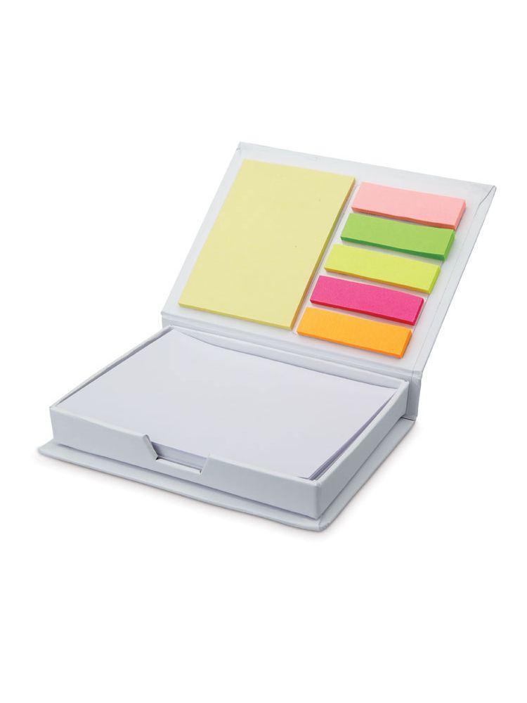 Praktyczny kartonowy pojemnik na karteczki memo. Bloczek do notatek, 2 rodzaje karteczek samoprzylepnych. Średniej wielkości żółty bloczek samoprzylepny i 5 różnokolorowych znaczników do notatek. FSC®-certified | FSC 100%, P5.1, FSC-C213206
