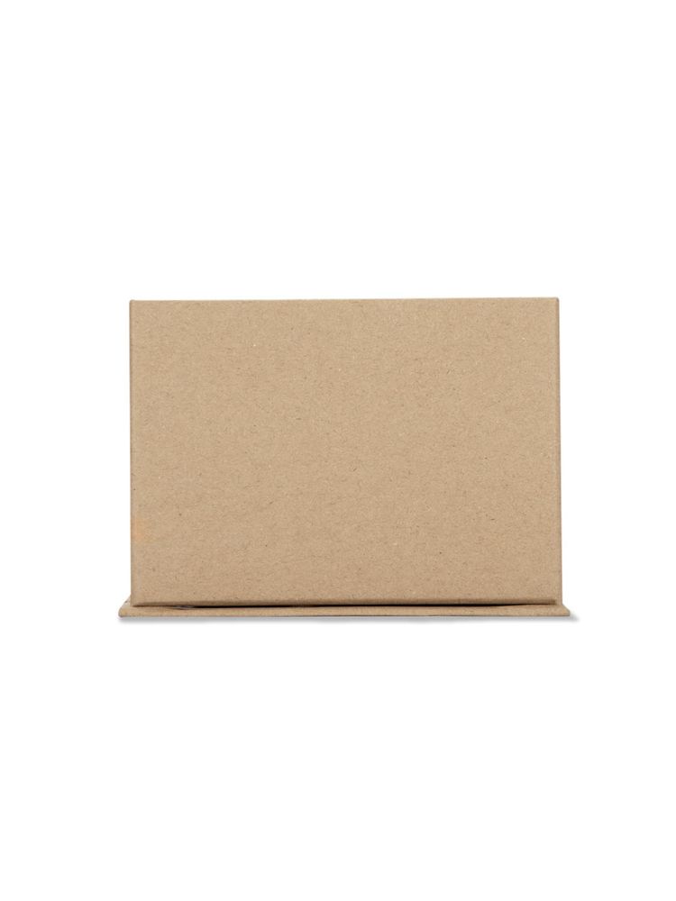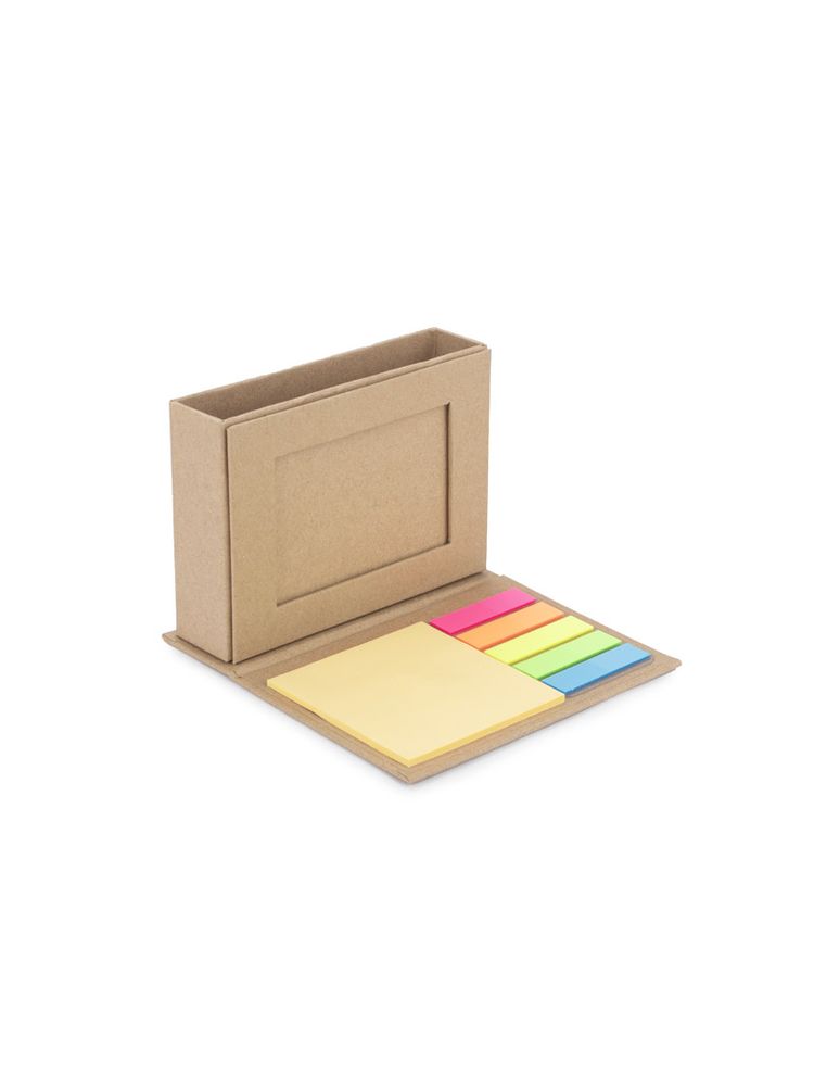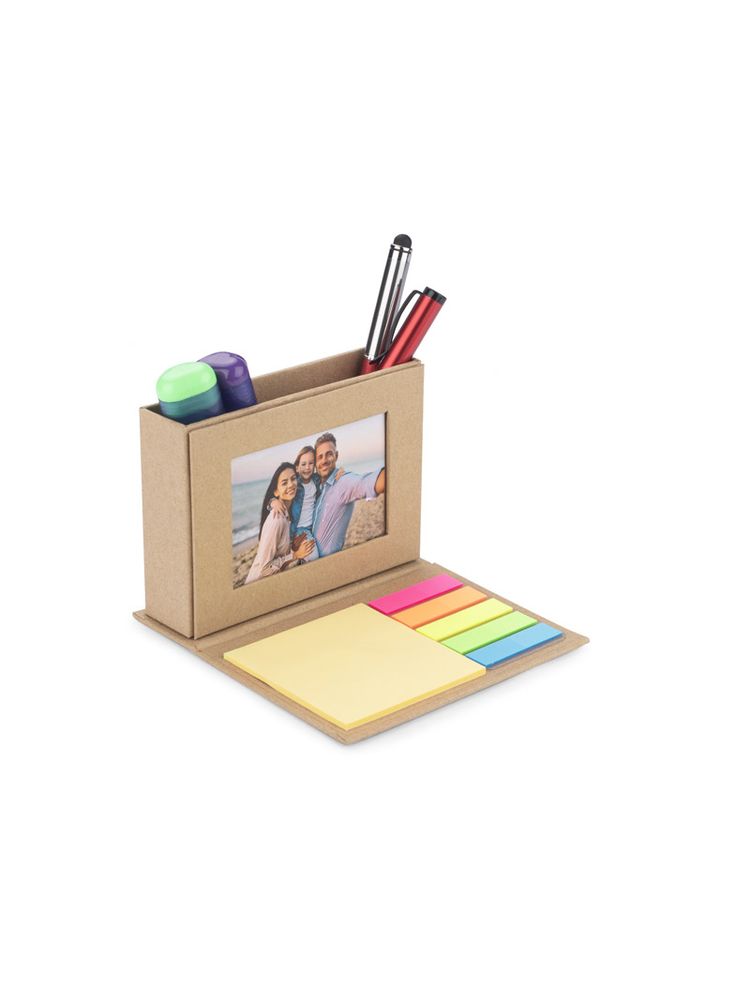 Pojemnik MEFO wykonany został z papieru w kolorze brązowym. Pełni on funkcję przybornika na biurko. Posiada miejsce na długopisy lub inne wybrane przybory, karteczki samoprzylepne do zapisywania notatek, a także miejsce na wizytówkę.