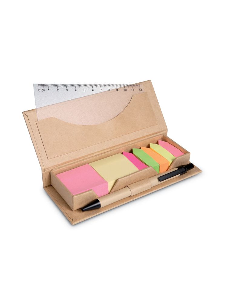 Przybornik na karteczki samoprzylepne z tektury z recyklingu z pasującym długopisem. Średnie karteczki samoprzylepne z papieru z recyklingu w 2 kolorach i 5 markerów w różnych kolorach. Dopasowany długopis z przyciskiem i papierowym wkładem. Niebieski tusz. Uchwyt na długopis. Kieszeń z przezroczystą linijką PP 12 cm.