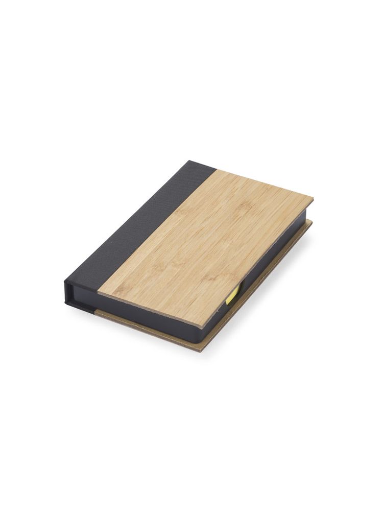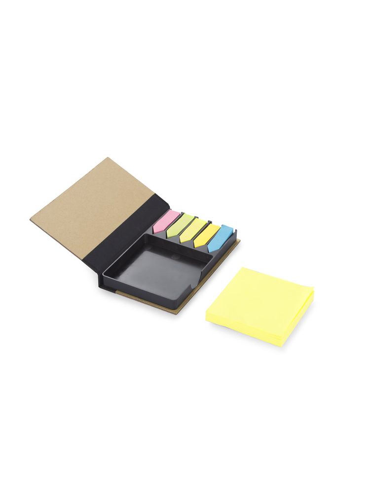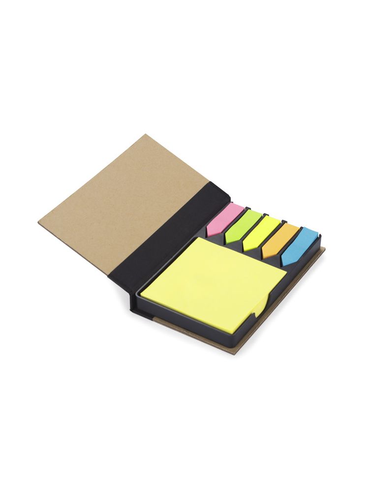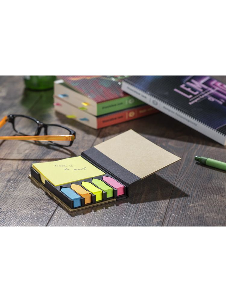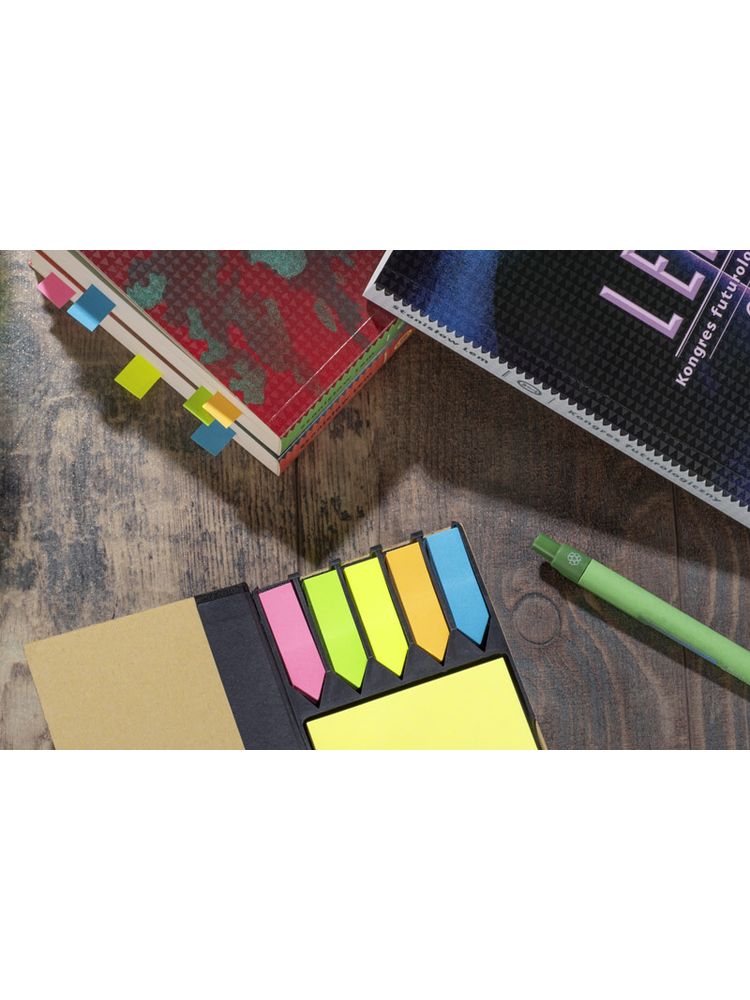 Praktyczny zestaw karteczek na biurko. Zestaw zawiera żółte samoprzylepne karteczki do zapisków a także 5 kolorowych karteczek do zaznaczania. Etui wykonane z bambusa.