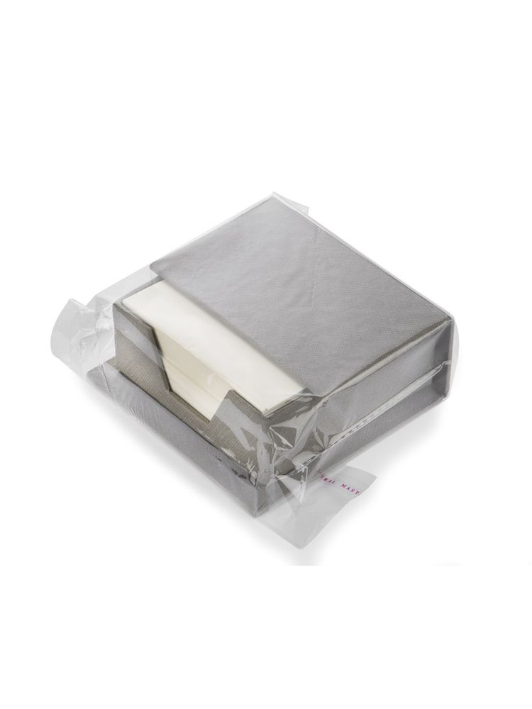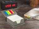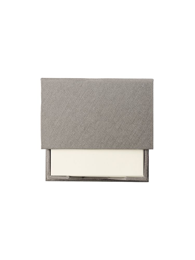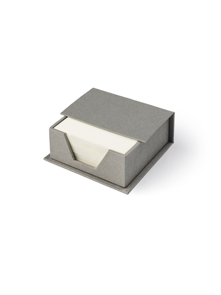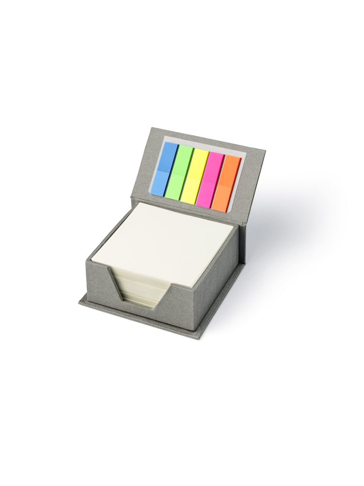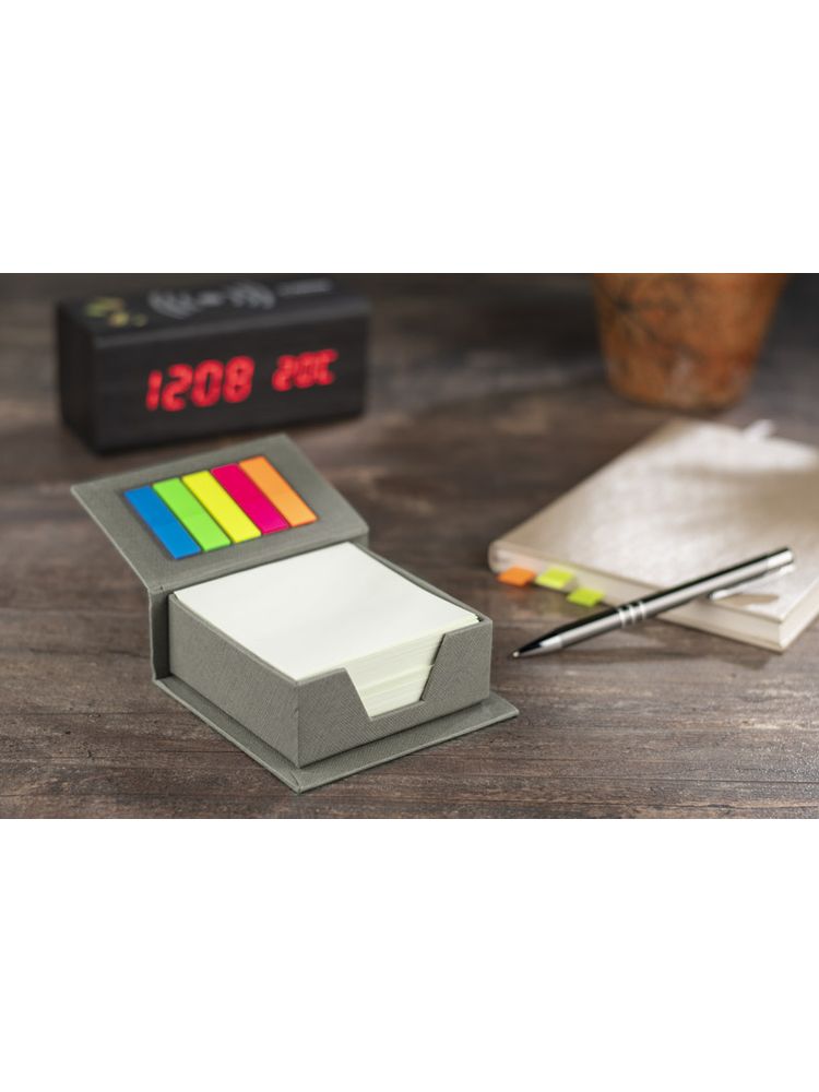 Praktyczna kostka z zestawem karteczek na biurko wykonana z szarego papieru o teksturze drobnej kratki. Kostka zawiera 300 luźnych kartek na notatki. Na wewnętrznej stronie wieczka przyklejone karteczki memo w pięciu kolorach.