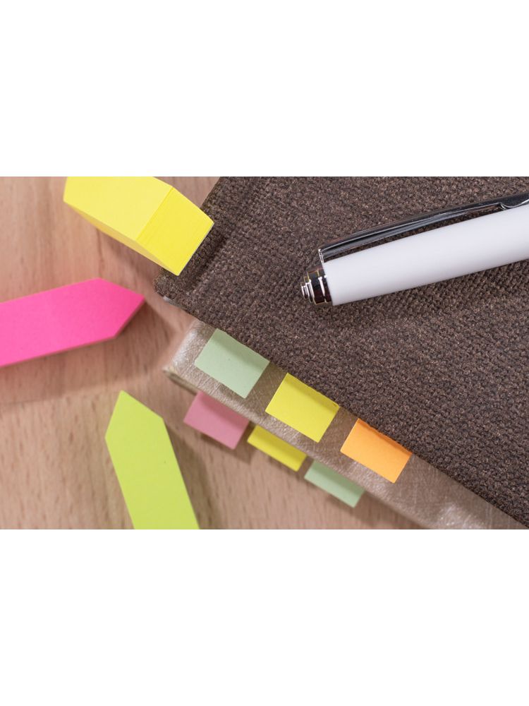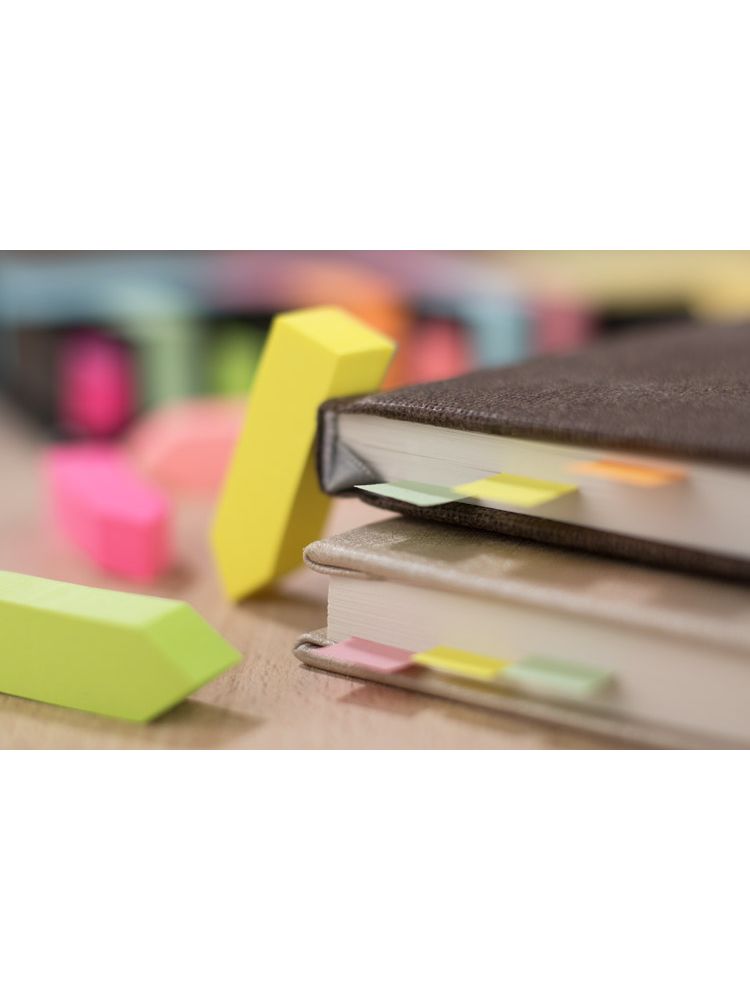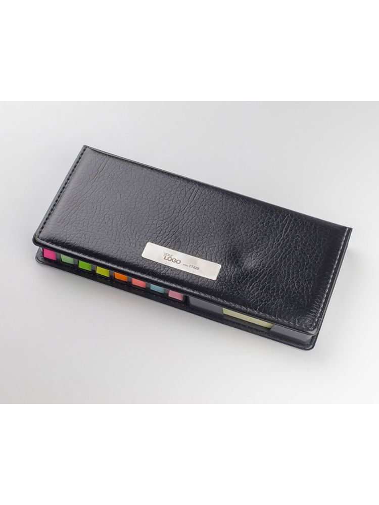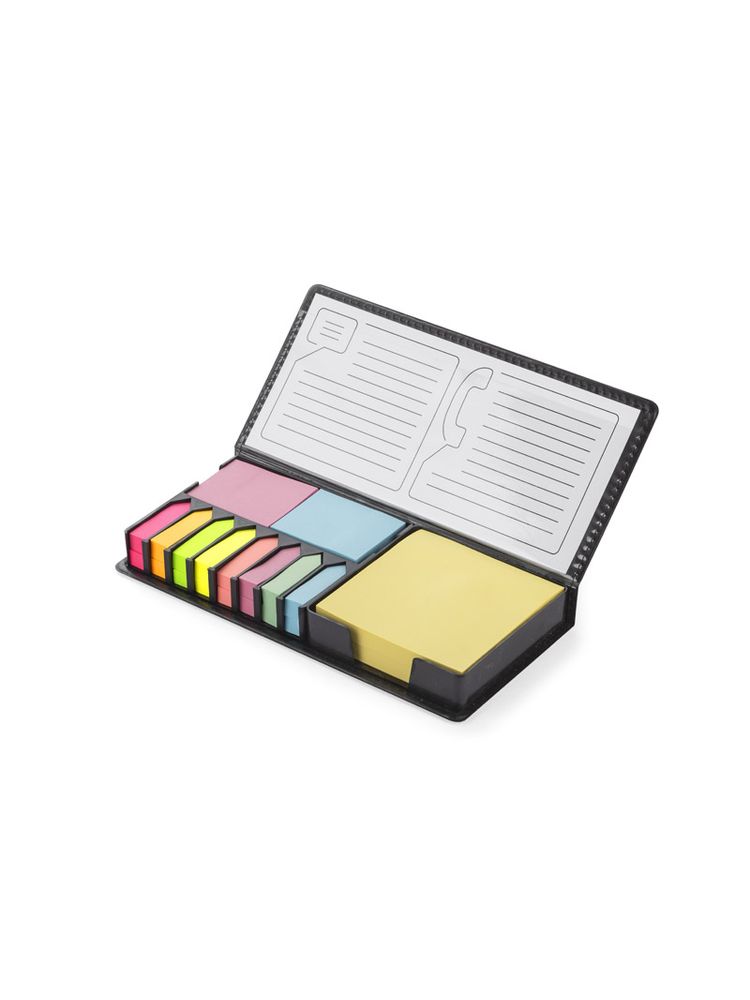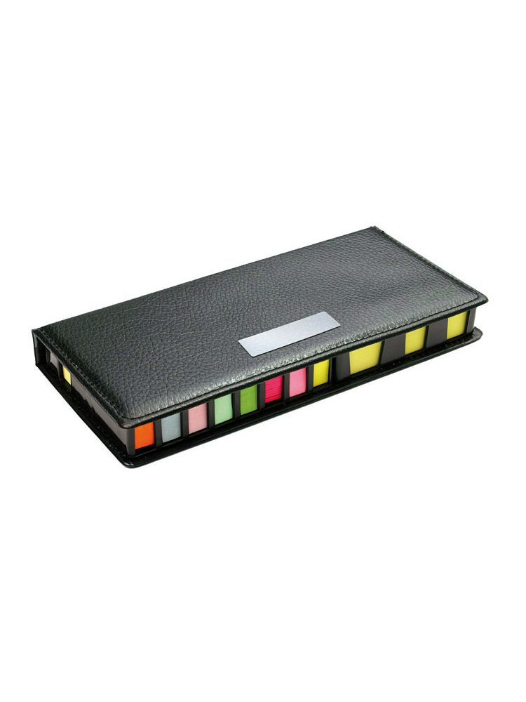 Zestaw karteczek samoprzylepnych pakowanych w czarne etui. Zestaw zawiera 1 bloczek dużych karteczek, 2 bloczki średnich karteczek i 8 małych bloczków zakładek indeksowych w różnych kolorach. Pudełko posiada miejsca na każdy z zestawów karteczek, dzięki czemu te się nie mieszają. W etui umieszczona jest kartka z miejscem na notatki. Logo grawerujemy na metalowej blaszce, którą można umieścić na wierzchu etui. Blaszka jest dołączona osobno.