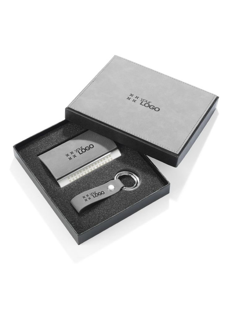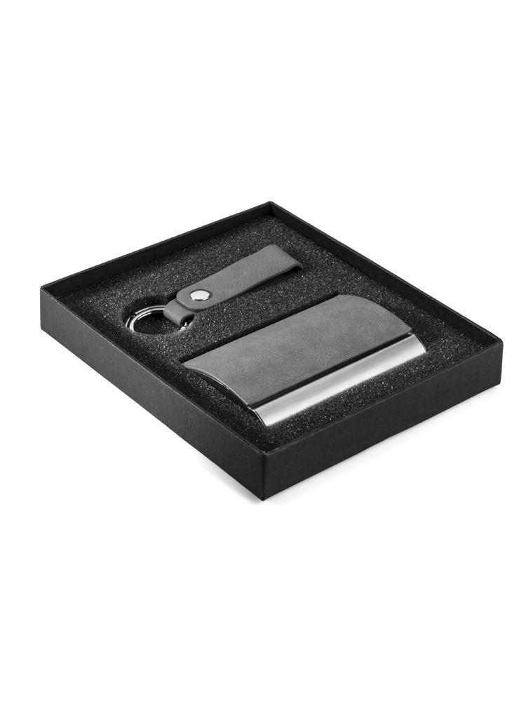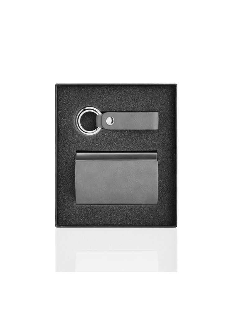 BORIS to elegancki zestaw upominkowy w którego skład wchodzi wizytownik oraz brelok. Zapakowany w gustowne czarne pudełko. Wieczko pudełka wykończone jest ekoskórą w takim samym kolorze jak brelok i wizytownik. Możliwe jest uzyskanie wyjątkowego efektu znakowania.