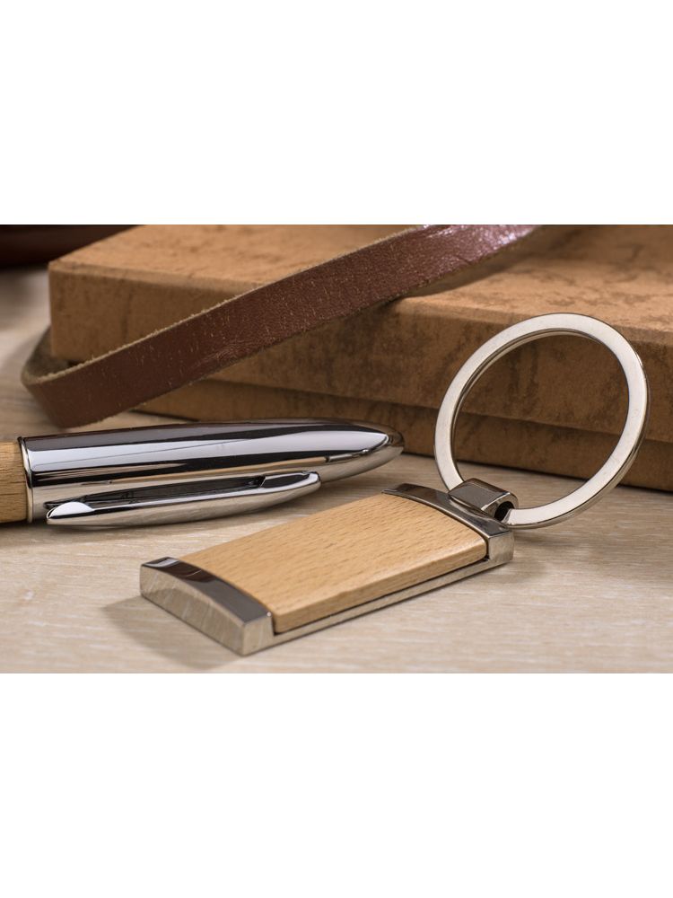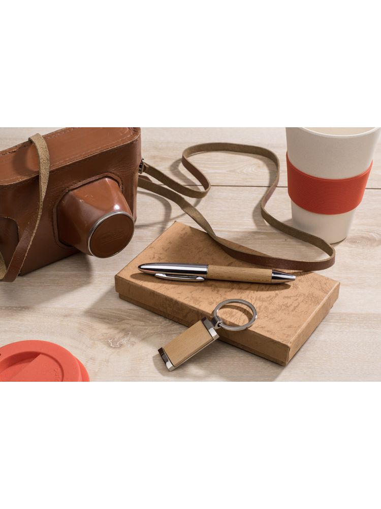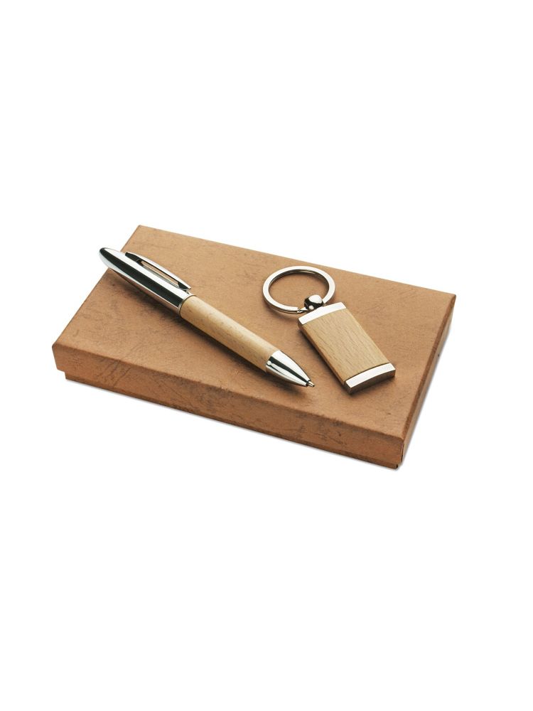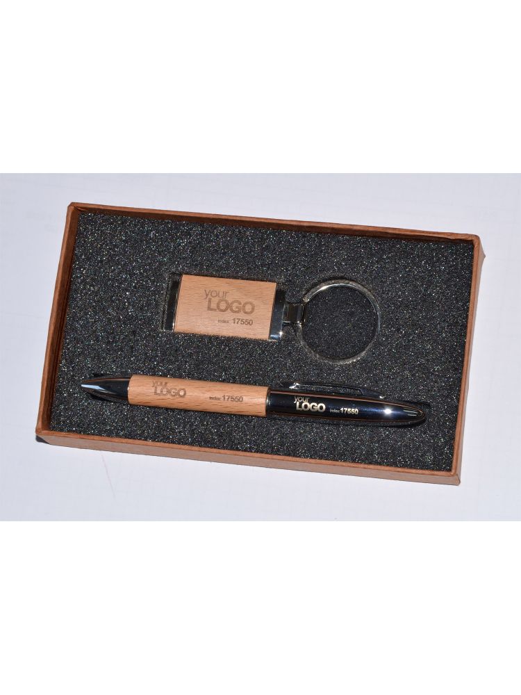 Ekologiczny zestaw upominkowy składający się z długopisu oraz breloka wykonanych z metalu i drewna. Długopis z czarnym wkładem. Grawer zrobimy na długopisie lub też nadrukujemy logo na pudełku.