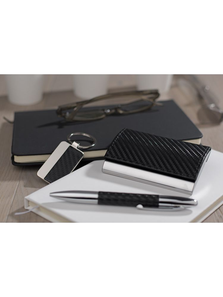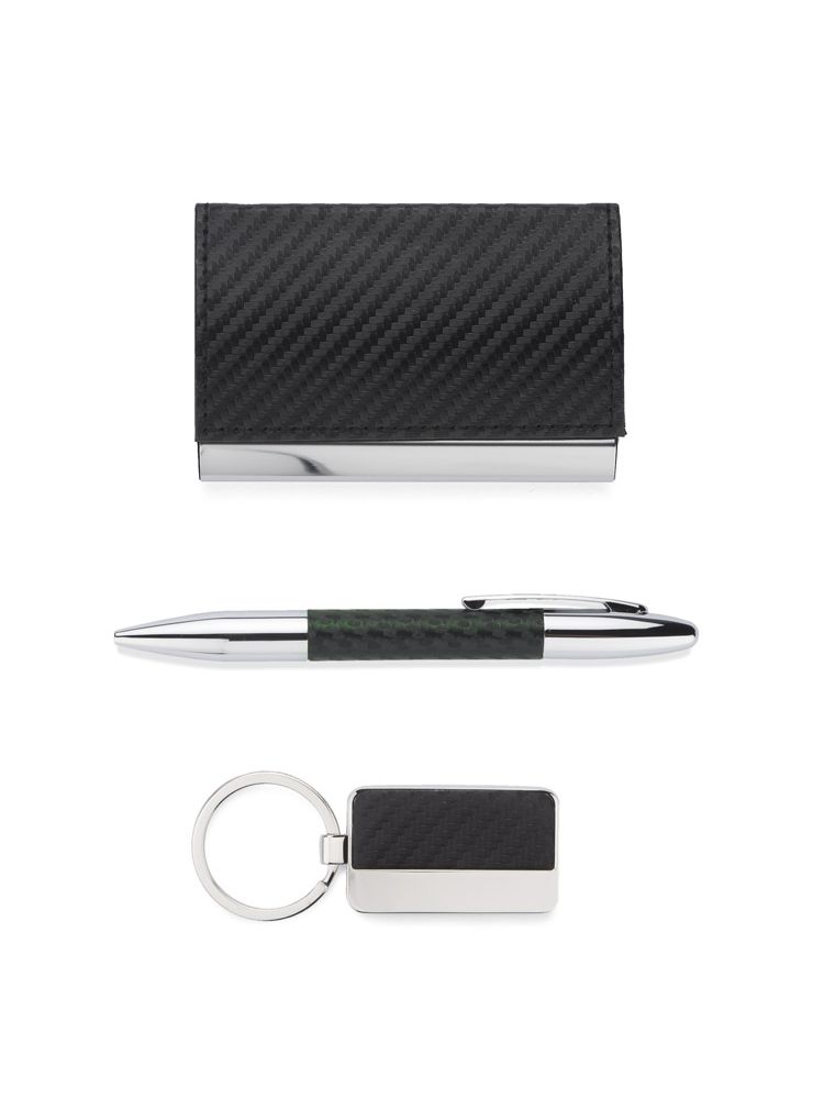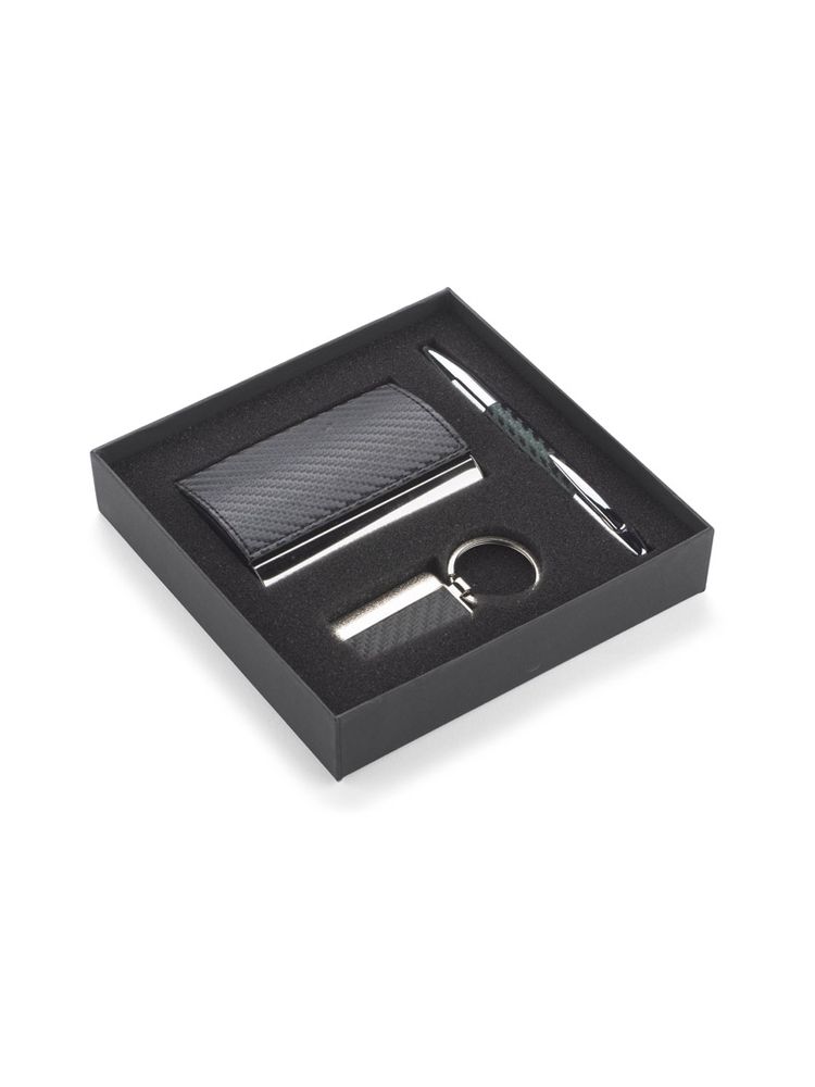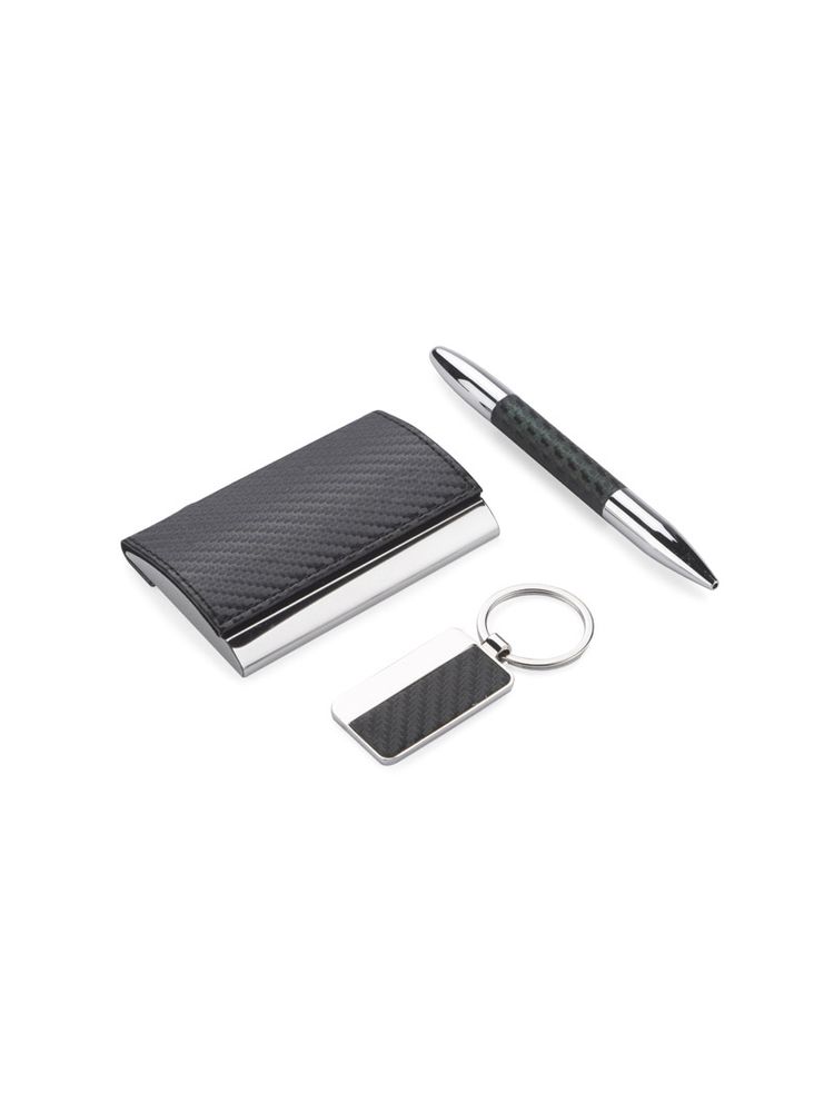Elegancki zestaw upominkowy w skład którego wchodzą wizytownik, brelok oraz długopis. Całość zapakowana w czarne puełko. Logo wygrawerujemy na breloku albo nadrukujemy na wizytowniku. UWAGA – długopis czarny opalizujacy na zielono. Reklamacji na to nie przykmujemy