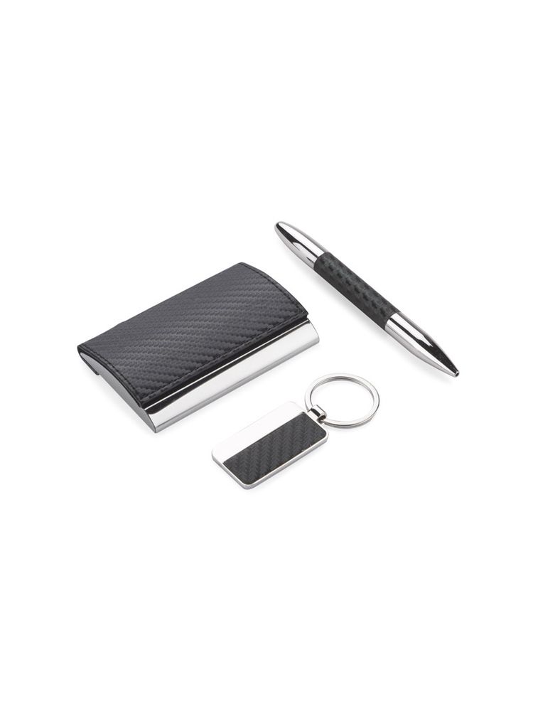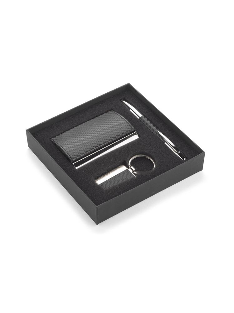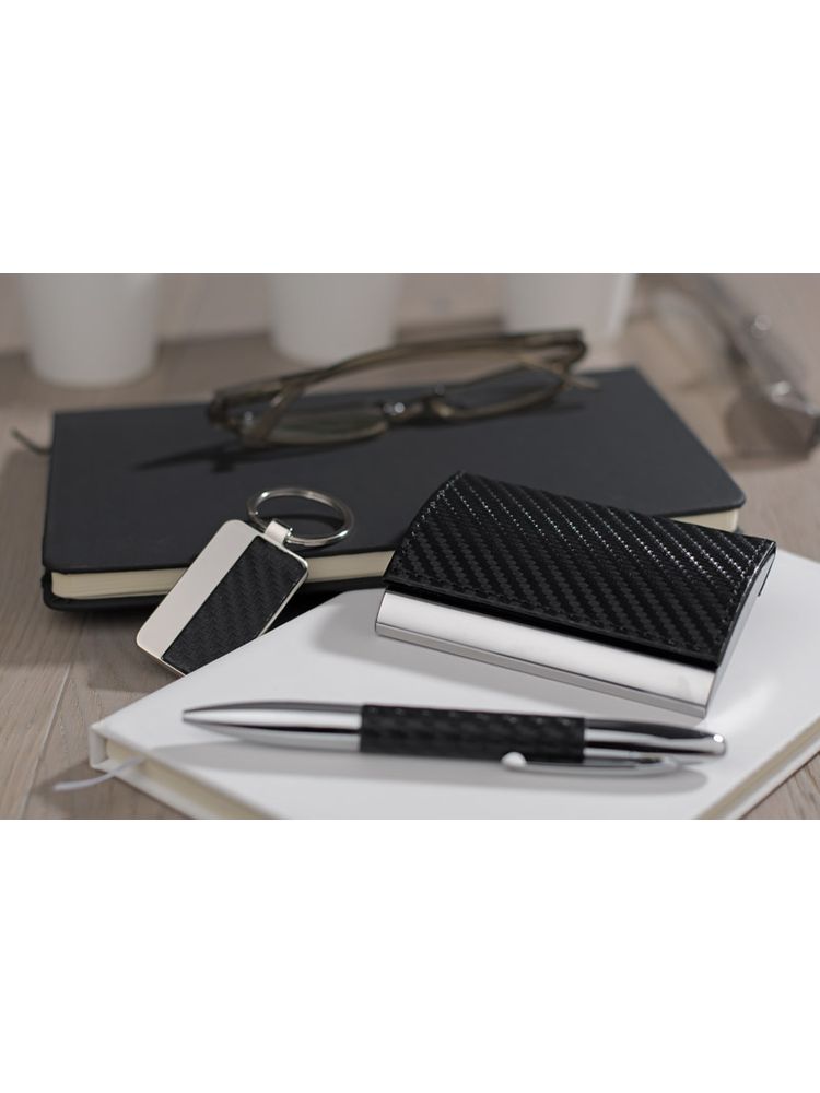Elegancki zestaw upominkowy w skład którego wchodzą wizytownik, brelok oraz długopis. Całość zapakowana w czarne puełko. Logo wygrawerujemy na breloku albo nadrukujemy na wizytowniku. UWAGA – brak rękawka. Reklamacji na to nie przyjmujemy.