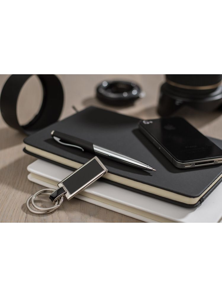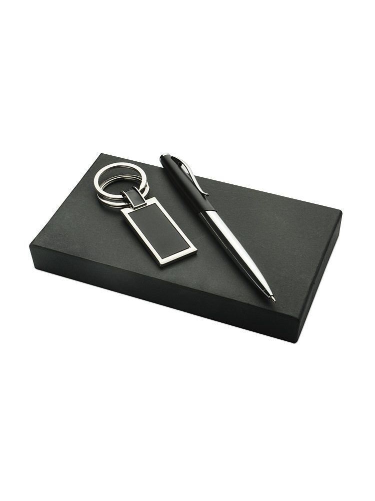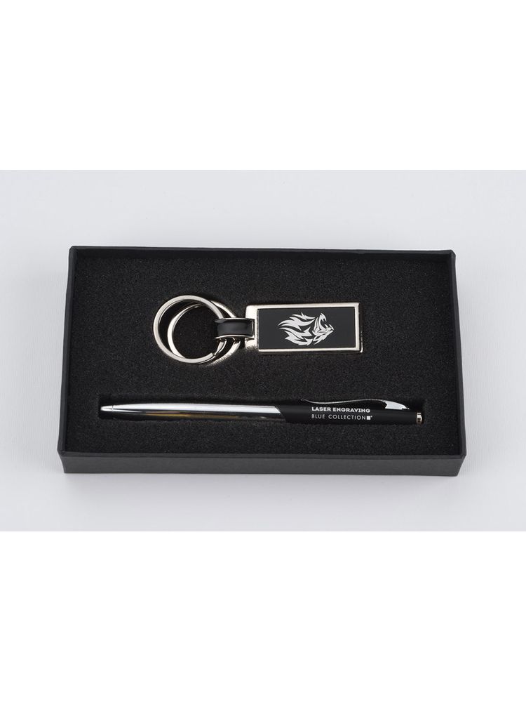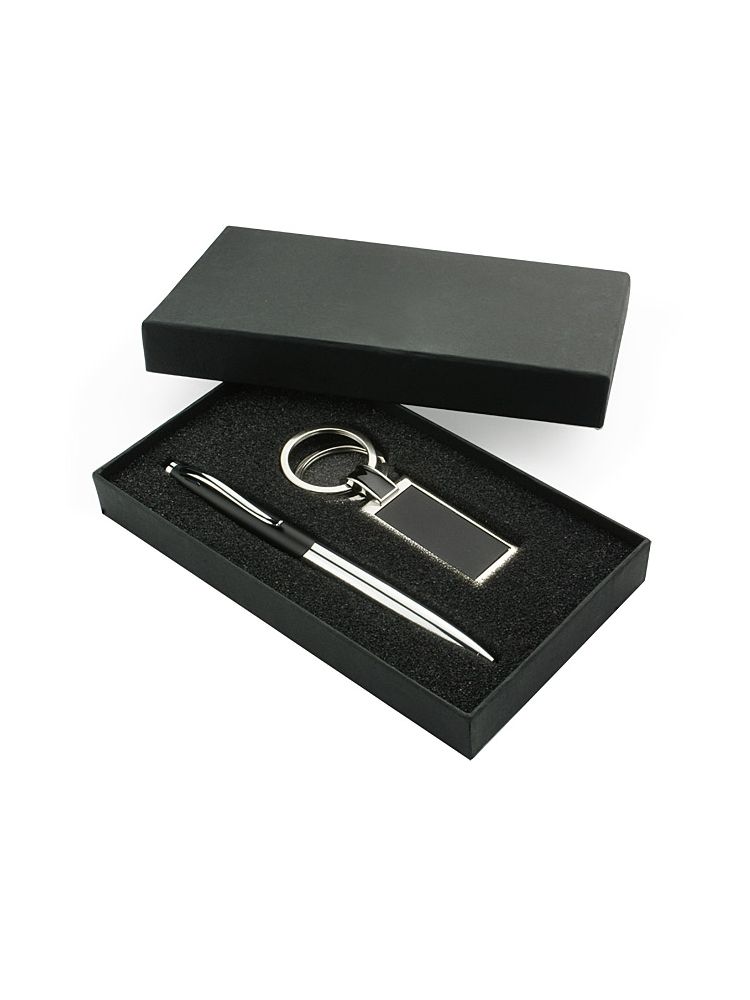Zestaw upominkowy składający się z breloka i długopisu. Długopis z czarnym wkładem. Dodatkowo brelok posiada dwa kółeczka, które ułatwią podział kluczy. Grawer zrobimy na długopisie lub też nadrukujemy logo na pudełku.