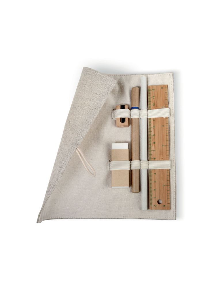 Zestaw biurkowy w etui wykonanym z juty i bawełny. W komplecie bambusowa linijka 15cm, papierowy ołówek, kartonowy długopis z niebieskim wkładem, drewniana temperówka i gumka. Bambus jest produktem naturalnym, dlatego mogą wystąpić nieznaczne różnice w kolorze, wzorze i rozmiarze.
