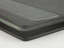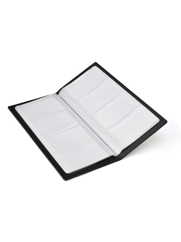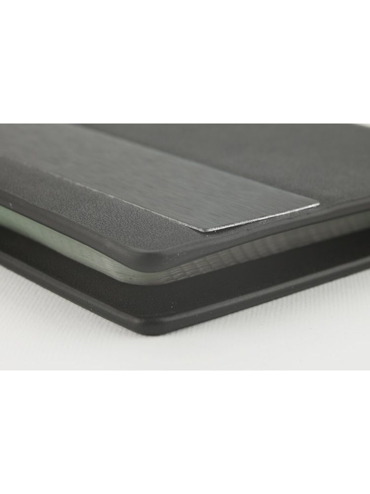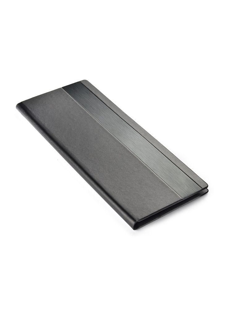 Praktyczne etui na wizytówki wykonane z ekoskórki PU, ozdobione szeroką aluminiową blaszką w czarnym kolorze dającą możliwość wykonania efektownego grawerowania logo. Etui mieści 160 wizytówek