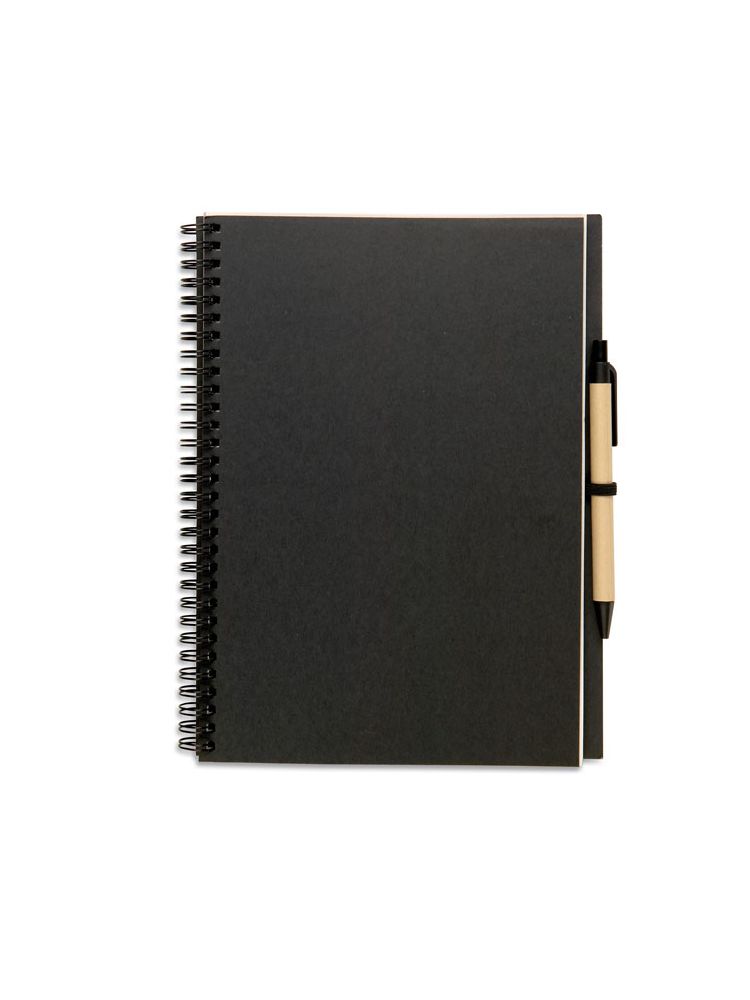 Notes z papieru z recyklingu z długopisem. Podwójna spirala. 140 czystych stron z papieru z recyklingu (70 kartek). Przyciskany długopis w kartonie pochodzącym z recyklingu i biodegradowalnego plastiku. Niebieski tusz. Czarny, elastyczny uchwyt na długopis.