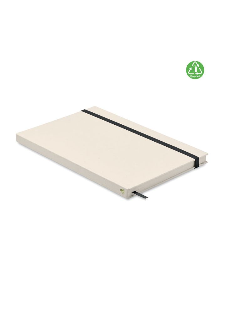 Zeszyt A5 z twardą okładką i 160 stronami w linie (80 kartek 80 g/m²) wykonany w 70% z kartonów po mleku i w 30% z papieru z recyklingu. Elastyczny pasek zamykający, zakładka z tasiemki.