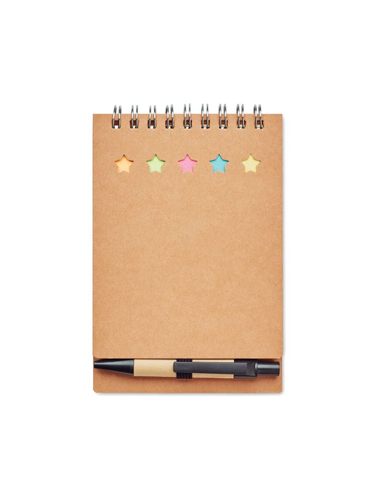 Notatnik z recyklingu z długopisem i karteczkami samoprzylepnymi. Miękka okładka z papieru z recyklingu. Podwójne okablowanie. 40 kartek w linie. Elastyczny uchwyt na długopis. 25 karteczek samoprzylepnych i 5 markerów w różnych kolorach. Długopis z przyciskiem w kartonie z recyklingu i biodegradowalnego plastiku. Niebieski tusz.