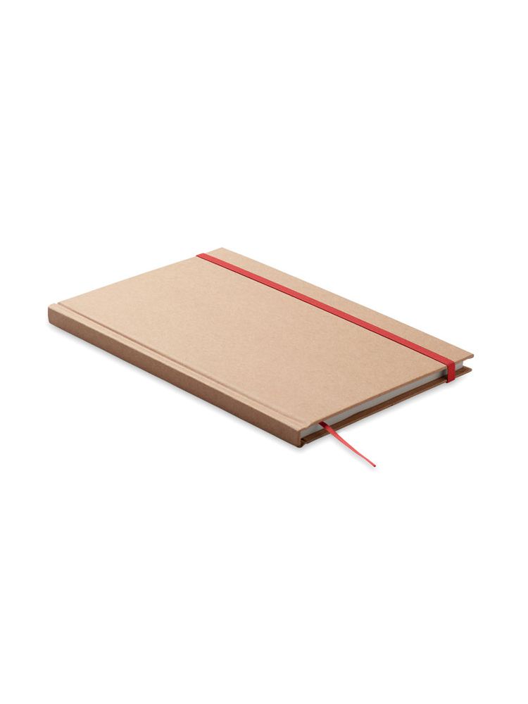 Notatnik A5 w twardej okładce z kartonu z recyklingu. 200 stron w linie z papieru makulaturowego (100 kartek 80 g/m²). Dopasowana gumka zamykająca i tasiemka do oznaczania stron. Made in EU.