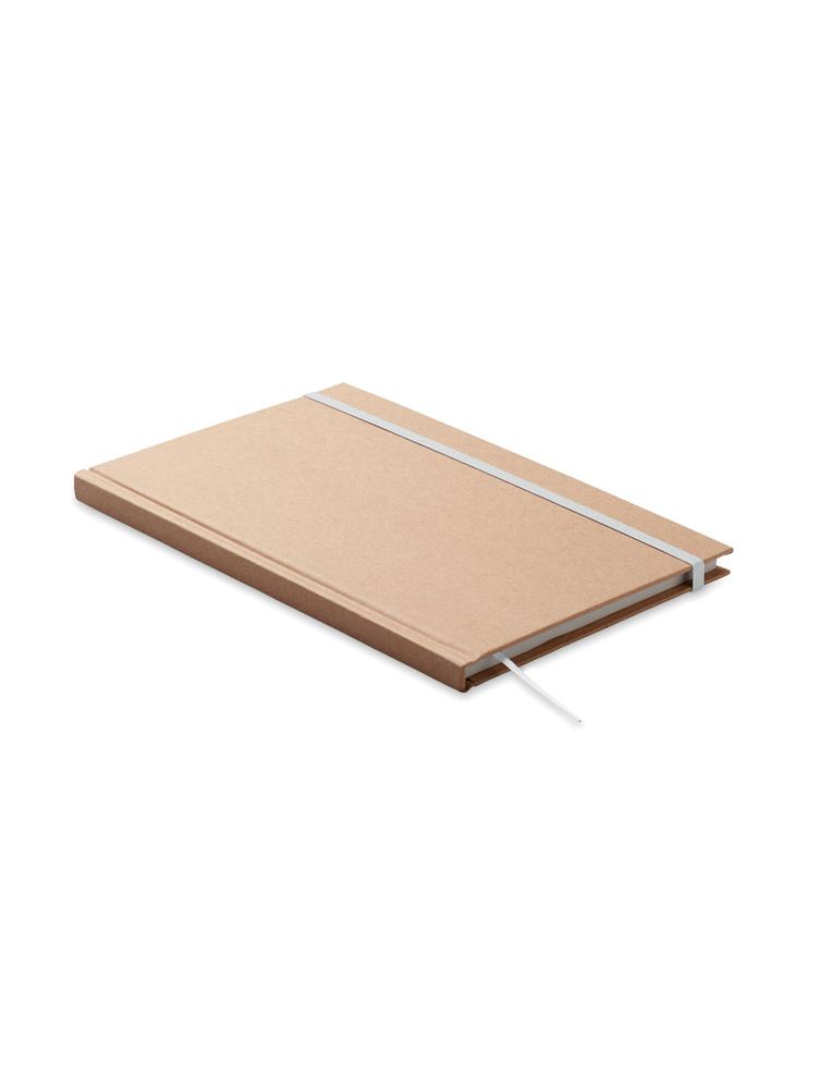 Notatnik A5 w twardej okładce z kartonu z recyklingu. 200 stron w linie z papieru makulaturowego (100 kartek 80 g/m²). Dopasowana gumka zamykająca i tasiemka do oznaczania stron. Made in EU.
