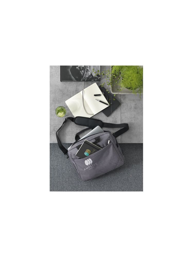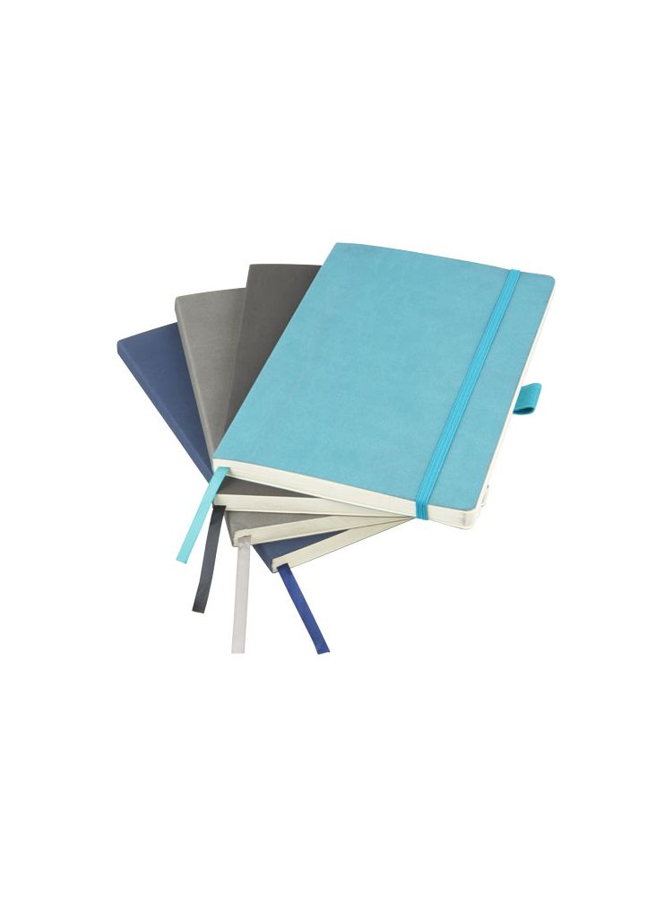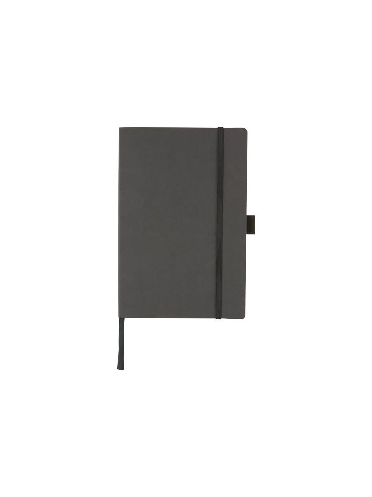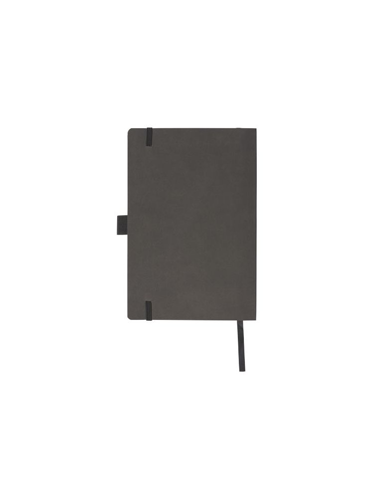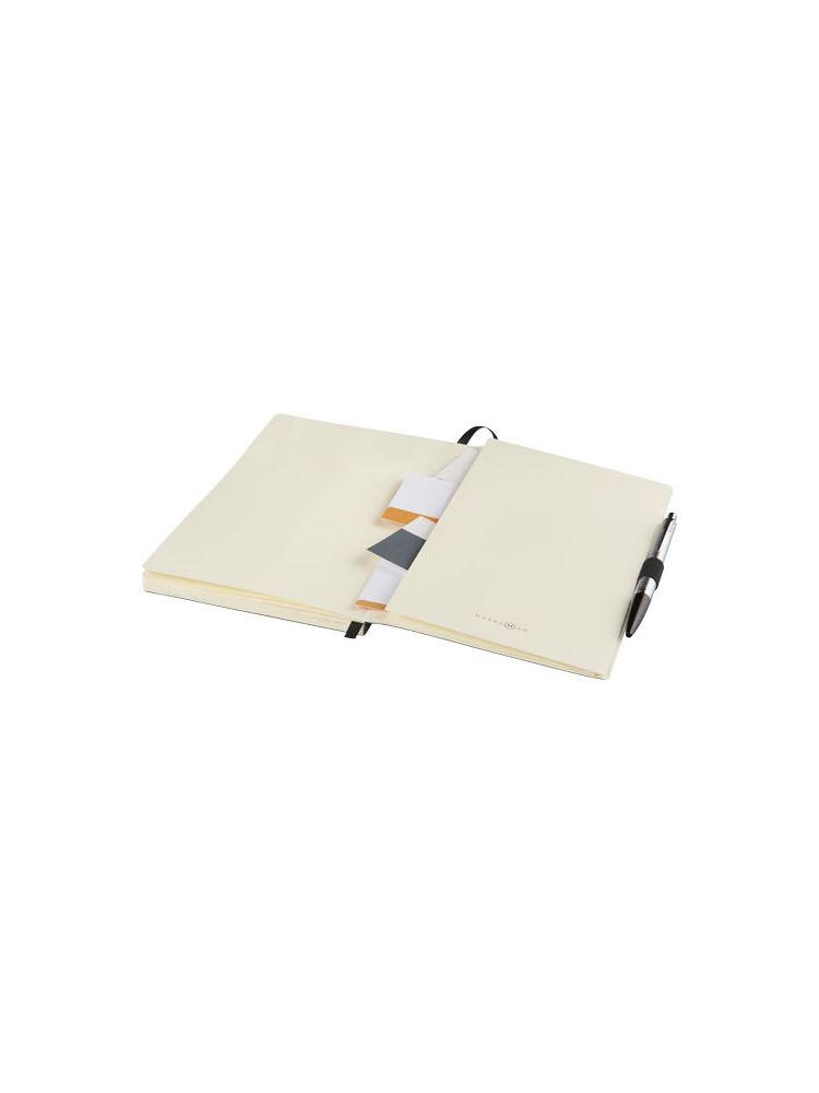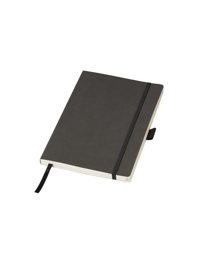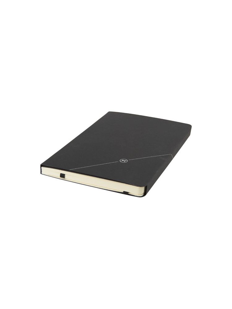 Elastyczny i miękki w dotyku notatnik (rozmiar A5) z wbudowanym elastycznym zamknięciem, wstążką, pętelką na długopis, kieszenią na dokumenty po wewnętrznej stronie okładki i 80 arkuszami (80 g) kremowego papieru w linię. Czarne opakowanie.